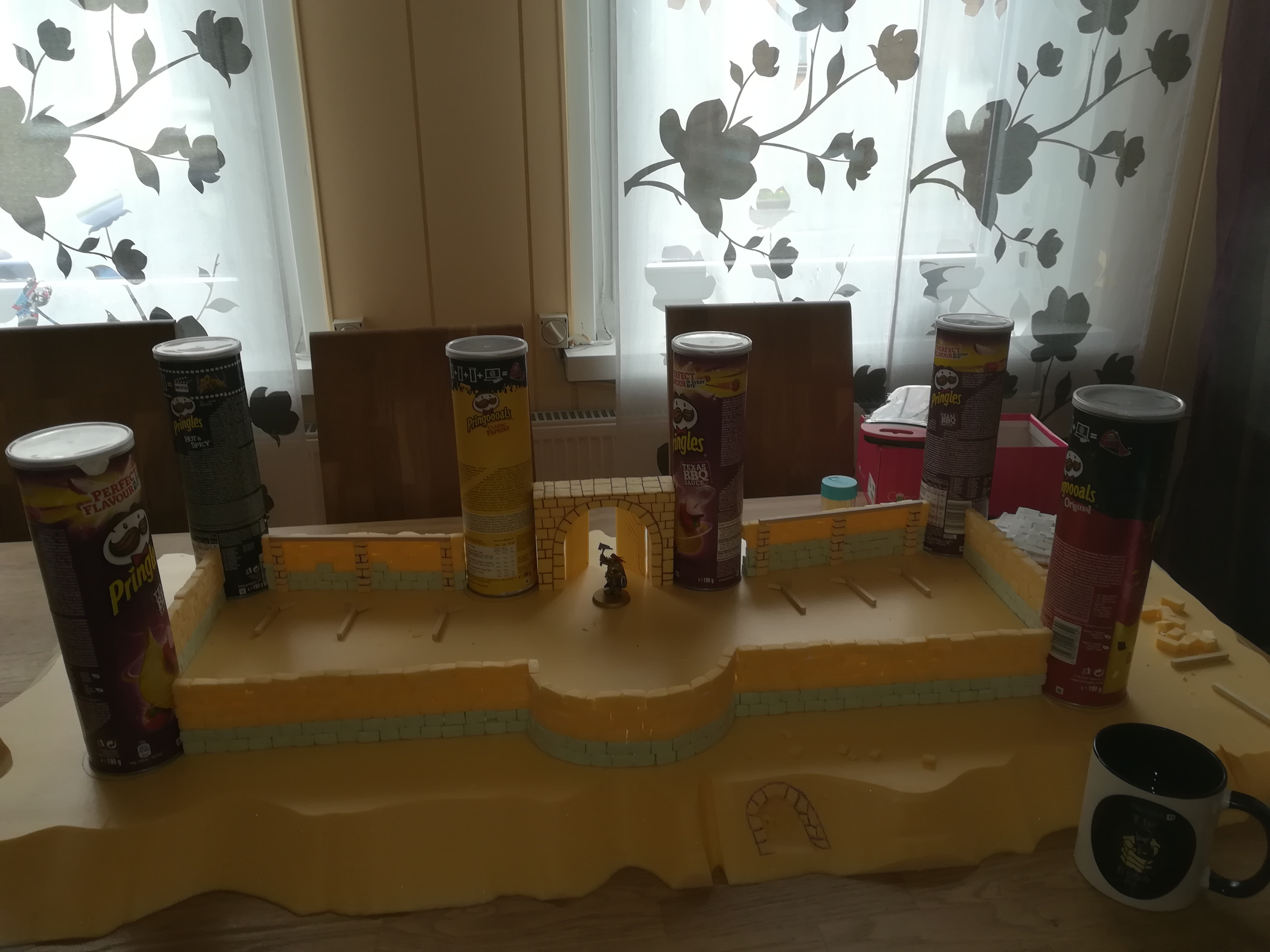 Die Chipsdosen sollen später Wehrtürme werden. Da ich 6 brauche, habe ich für die Dauer des Bauens ungefähr 2 Kilo Bauch mit eingeplant. ??