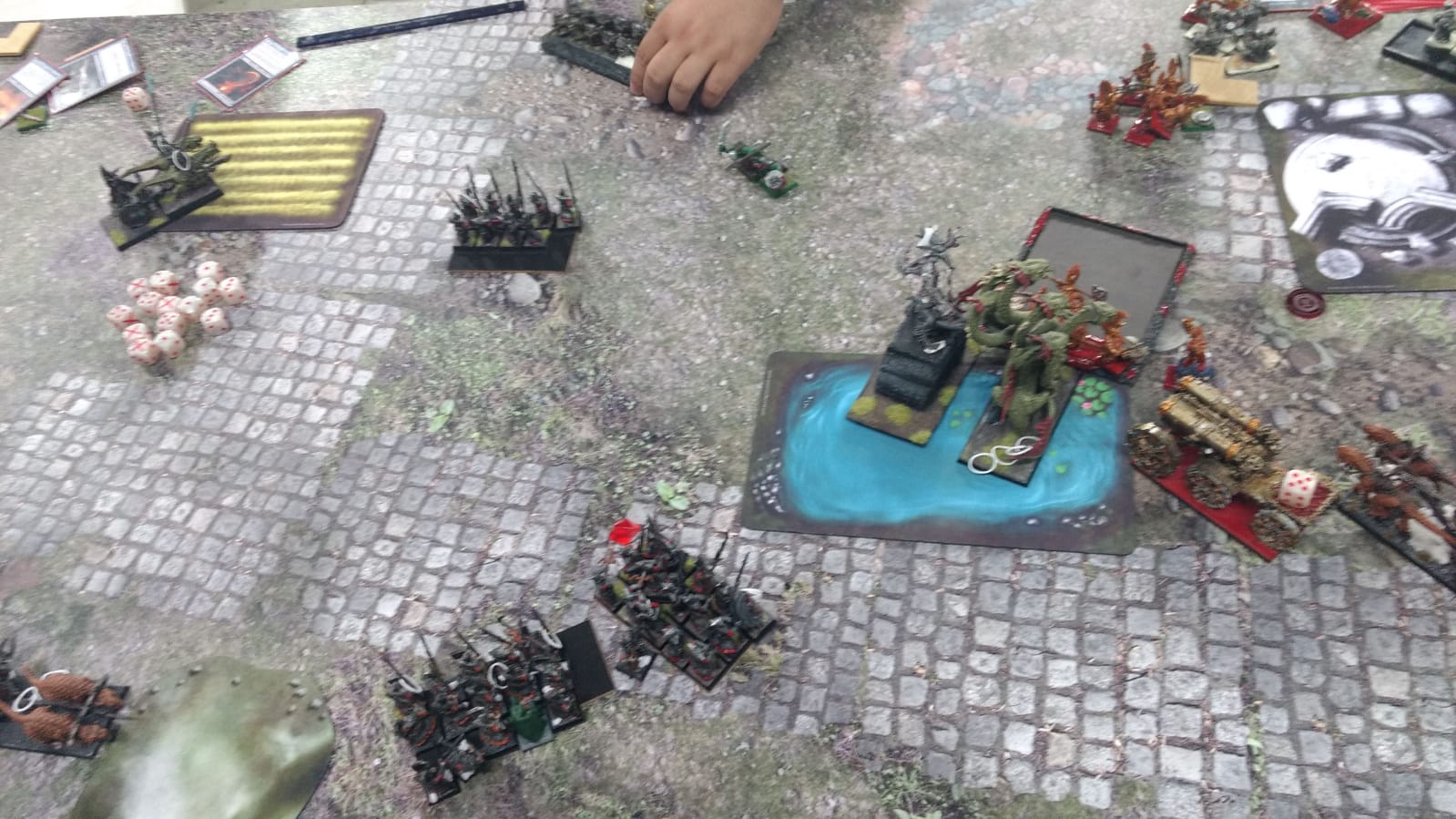 In meiner Mache ich mit der Hydra den Durchgang oben zum Unpassierbaren zu, schiebe Hydra und Lord in seine Jäger, die brechen im Nahkampf und er gibt mir die Hand in meiner 3. Runde, ein guter start ins Turnier, wenn man hier oben mitspielen will, muss man auf alle fälle jedes Spiel gewinnen, wenn eins nicht so hoch gewonnen wird, muss der Rest dafür um so höher sein, das heißt jetzt natürlich auch, dass der Gegner noch stärker ist.