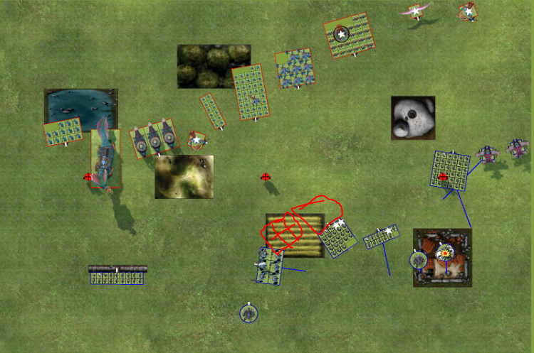 In meiner Dritten Runde hätte ich den Caiman Master mit den Speerträgern angreifen sollen, durch das Gelände hätte er wahrscheinlich kleine Hilfe bekommen. Aber die 9 Attacken haben mich abgeschreckt, dadurch hätten die Kopter den Flieger angehen können.