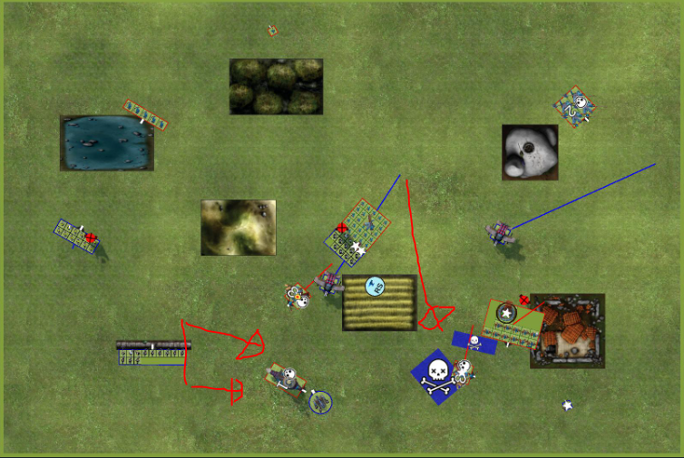 Auf der Flanke entwikelt sich ein multie Nahkampf, wo ich das bessere Ende habe und dann 3 Truppen in Ziel führe.