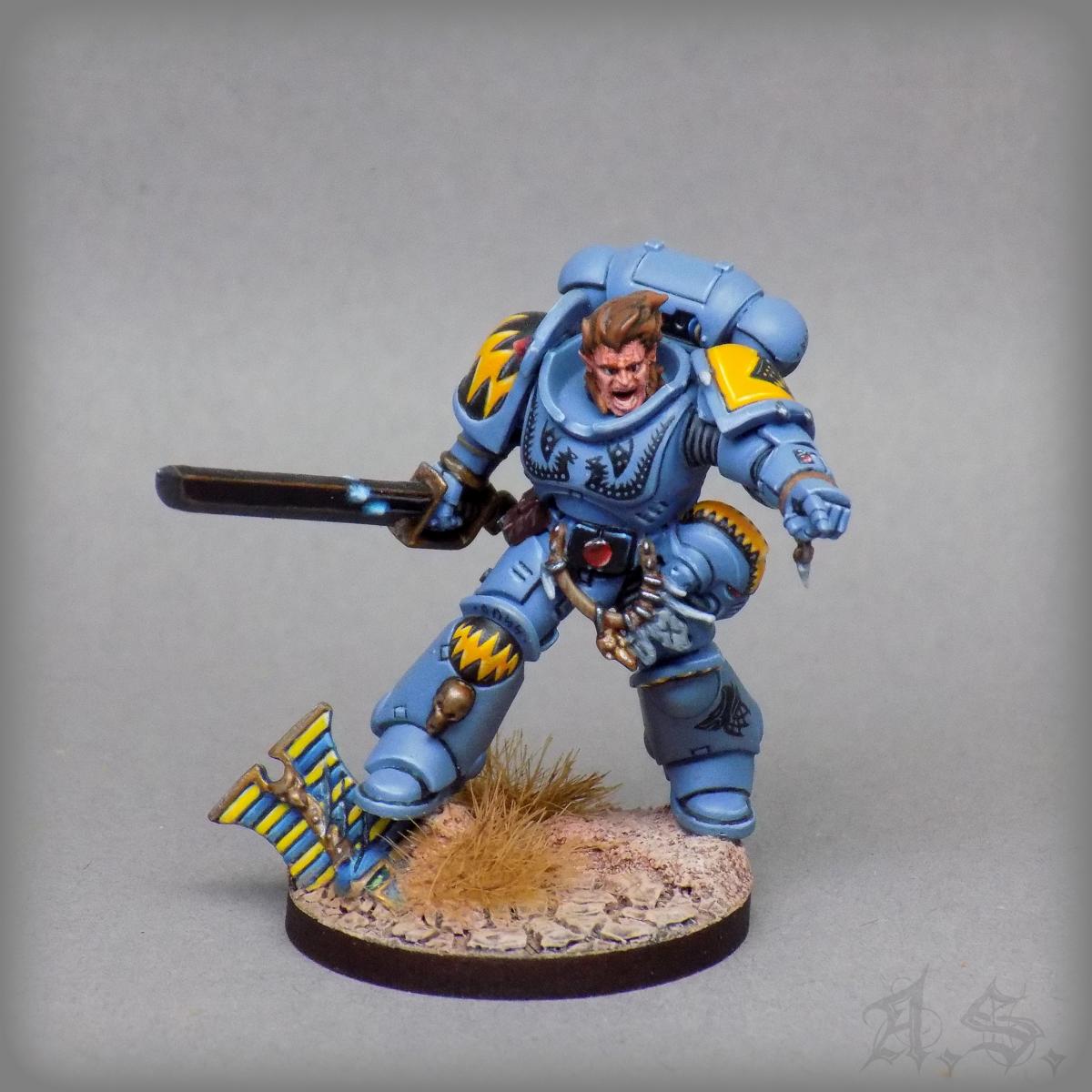 Diese Figur stammt aus einem der ersten 5er Primaris-Sets und wurde von mir mit Bits-Teilen der Space Wolfes umgebaut, darunter auch die Schulterpanzer.