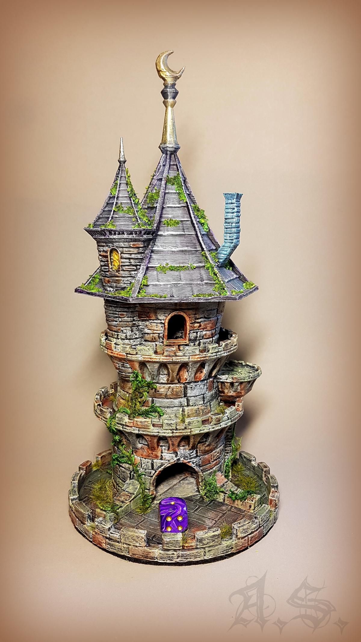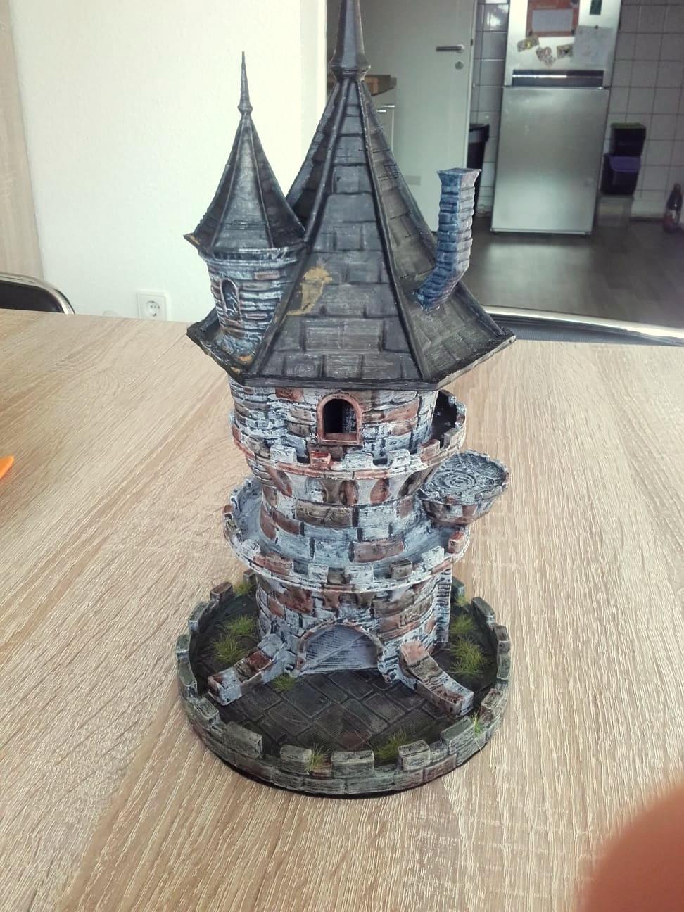 Dies möchte ich mit einem selbstgemachtem "3D Fantasie Würfelturm" eines Freundes machen, er hat mich gebeten für einen neuen Shop hier in Bad Nauheim dieses Modell (Prototyp) zu bemalen, der erste Turm wurde weiß, die nachfolgenden werden Farblich wie schwarz oder grau, damit die Basic besser passt und diese auch ohne Bemalkunst genutzt werden können.