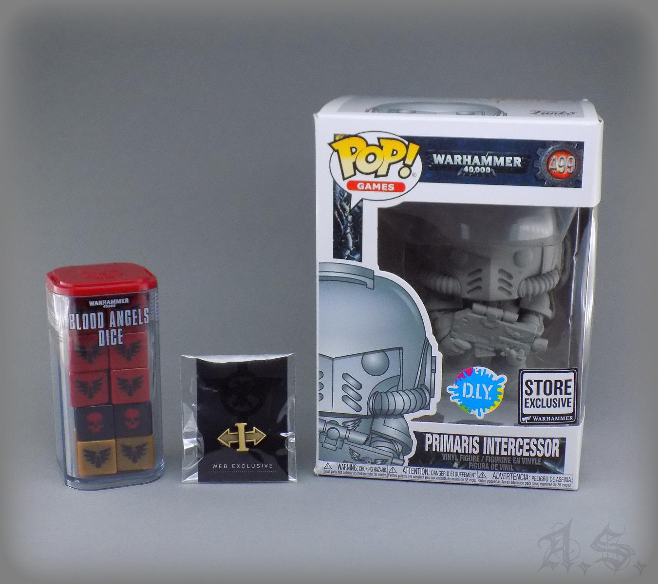 Ist für mich heute ein doch schöner Tag oder so, da meine Artikel eingetroffen sind, eine "Funko Pop" Figur (Store Exclusiv)e, "Blood Angels" Würfel und ein Present von GW, Web Exklusive Stecknadel... die finde ich recht geil....:love: