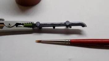Das Holz vom tragenden Balken habe ich etwas überarbeitet mit einer Pfeile für Rillen und Kratzer, so schauts mehr nach gebrauchtem Material aus, danach die Grundfarbe, einmal Tusche und nochmal leicht nachgearbeit.