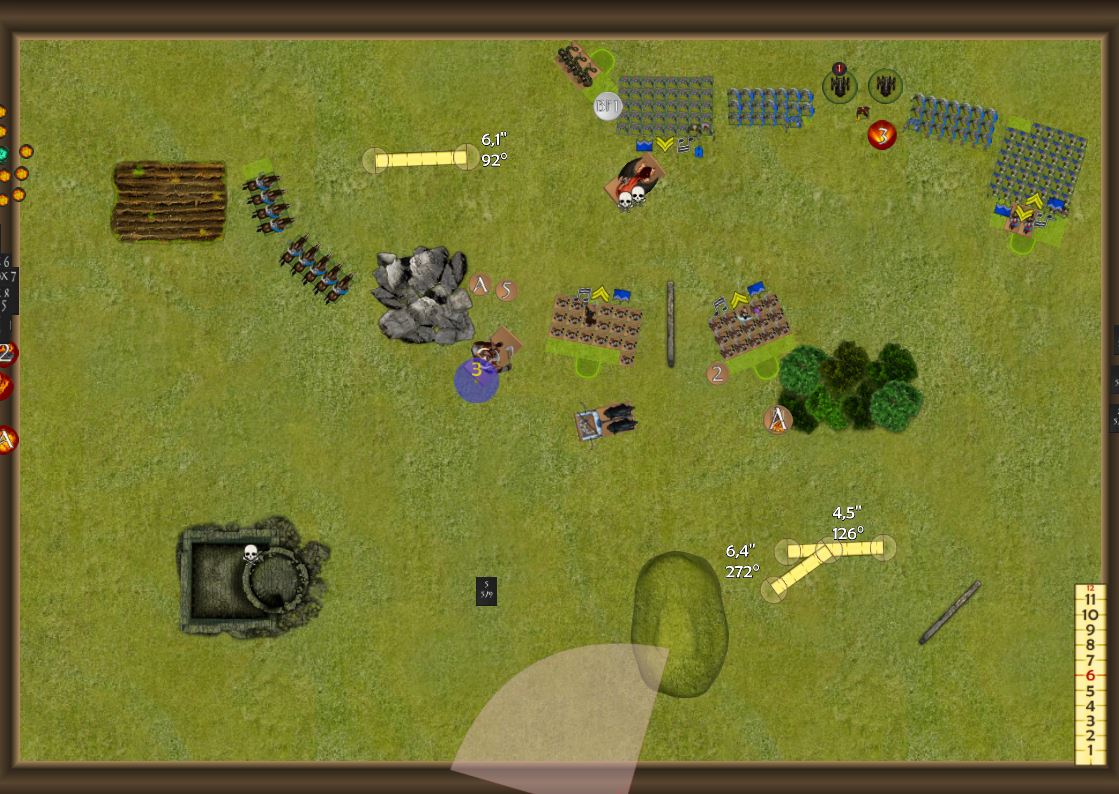 In seiner Runde werden die Blazing Glories in die Krieger mit Magier Stürmen, die Hellhounds werden wohl meine Flanke vom Streitwaagen bedrohen, die Lemres werden sich vielleicht zum Feldrak ausrichten.