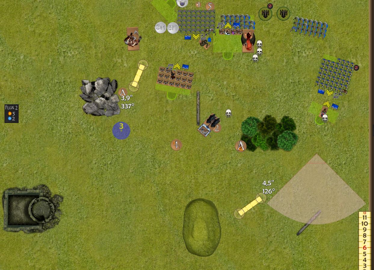In seiner Phase hat er die Hunde angegriffen und seinen Magier aus der Einheit gezogen um in der Magiephase das Flaming Swords auf alle 4 Einheiten zu zaubern, ich konnte es leider nicht Bannen
