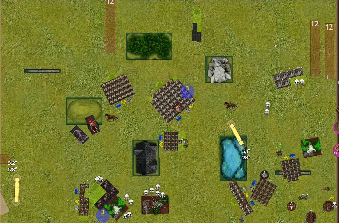 Der Angriff auch die Hunde ist zu verlockend und wir durchgeführt. Die Spinnen sammeln sich auf die 4 und stehen ungünstig sonst wir leider Breck the spirit auf die große Einheit gezaubert. Im Nahkampf Beißen meine Hunde den Champ nicht tot und werden verprügelt die Gobos wollen stehenbleiben müssen aber verfolgen.