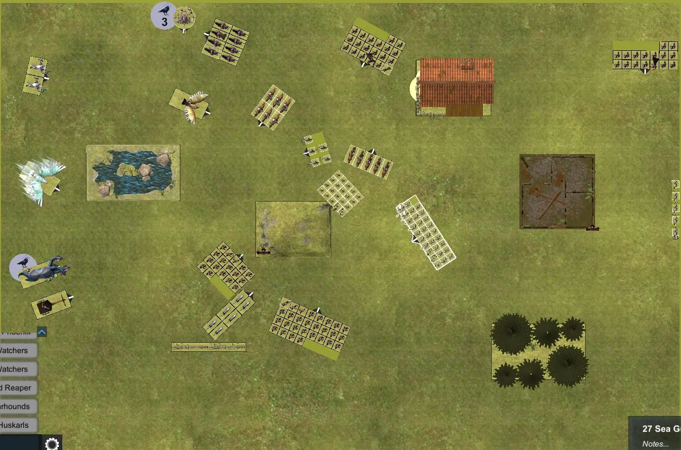 Wir sind in Runde 4 und wir liege Punkte technisch gleich auf, ich hab meine Hinterhalt schlecht gestellt und die Berserker sind tot und die Huskals werden vom Greifen gefessen