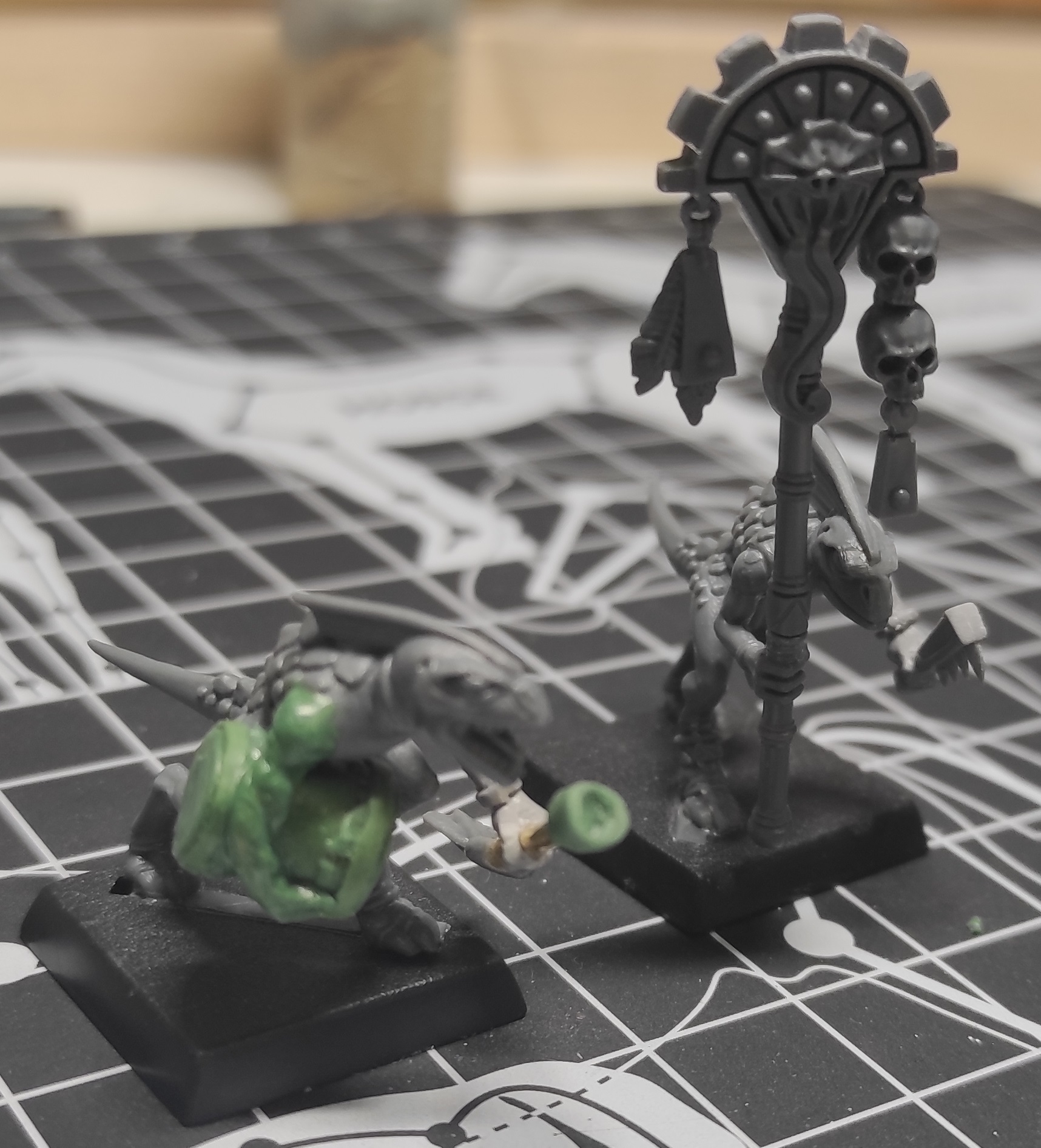Der eigentliche Grund für diesen Beitrag war allerdings, dass ich mich dazu durchgerungen habe, den Skinks eine Kommandoeinheit zu basteln. Da GW ja seit 20 Jahren keinen Anlass dafür sieht, passende Figuren auf den Markt zu bringen (gibts Standartenträger und Musiker in AoS überhaupt noch?) musste also die Stegadonbox, die Terradonbox, ein bisschen Messing und etwas Green Stuff herhalten.