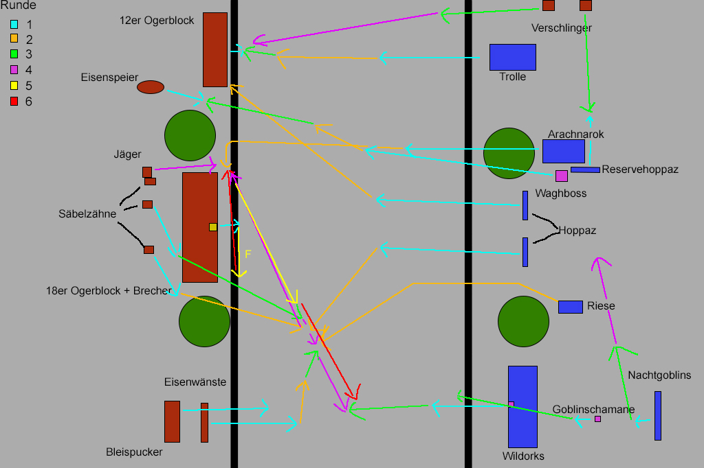 Alles rückt vor: Die Spinne in Richtung Eisenspeier, BOSS ebenfalls. Die Trolle machen sich auf zum 12er Ogerblock, die Wildorks gehen langsam auf die Bleispucker zu & die Hoppaz rücken provisorisch mittig vor.