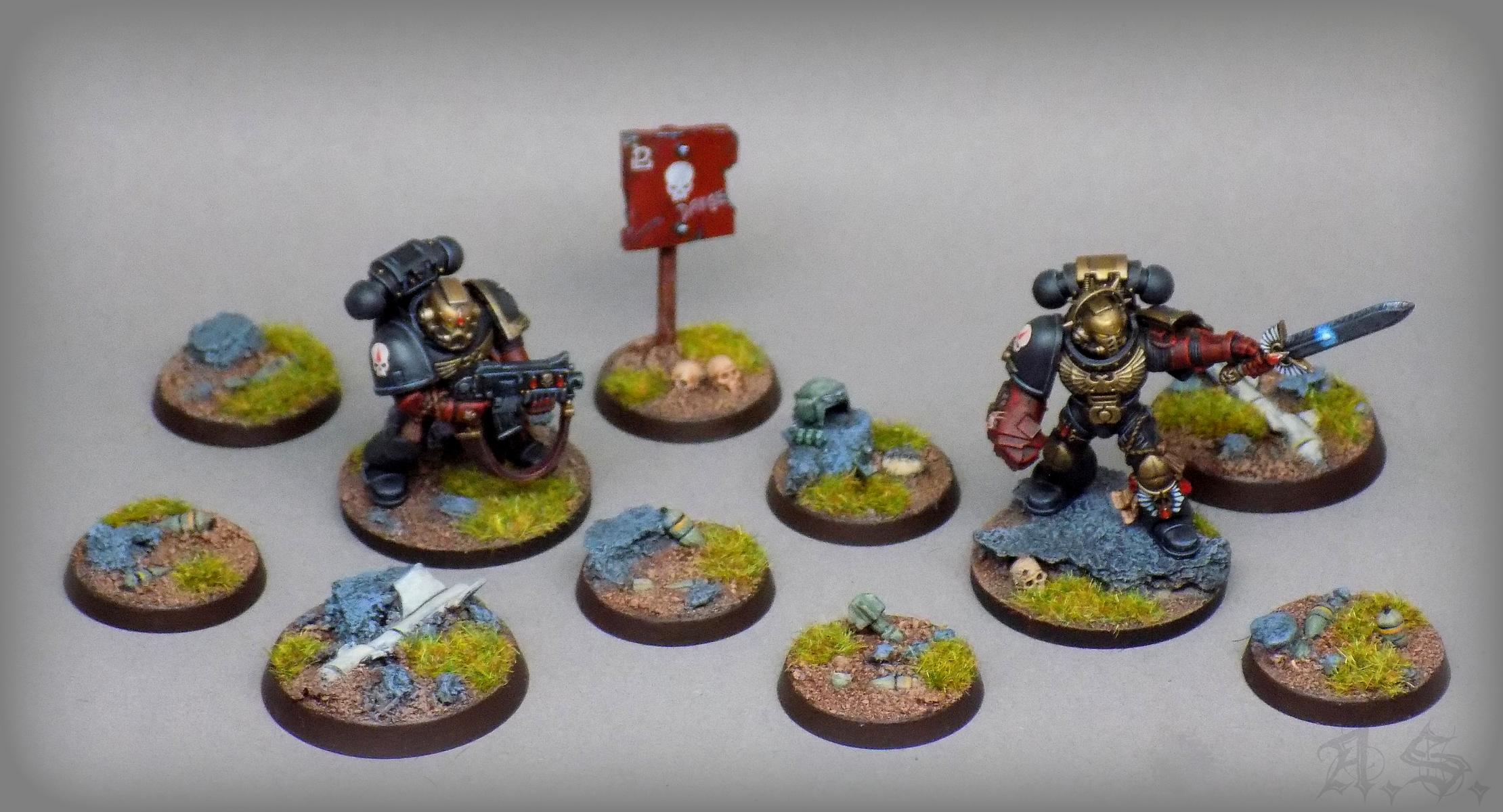 Also weiter Inspiration geholt und meine Bits-Boxen durchstöbert, um zu sehen was ich alles so zusammen bekommen, dabei rausgekommen sind 15 kleine "Geländestücke oder Marker" für meine Söhne auf 32mm und 25mm Base, sie sind zwar sind ganz soo cool wie die von GW, aber damit es zum einen in der Vitrine schön ausschaut und zum anderen auch auf der Spielfläsche seine Verwendung finden könnte, war es mal was neues für mich, was Spaß gemacht hat.