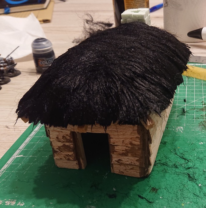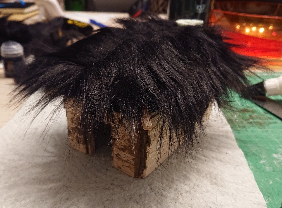 Die Überlegung war halt, dass Schwarz gleich die Schattierungen in der Tiefe liefert und ich mir darüber dann erstmal keine Gedanken machen muss. Erfahrung mit dem Material habe ich ansonsten keine. Da der nächste Schritt beim Hexenhaus die Dachkonstruktion sein wird, sollte die Verwendung des Teddyfells dann auch bald darauf dran sein.