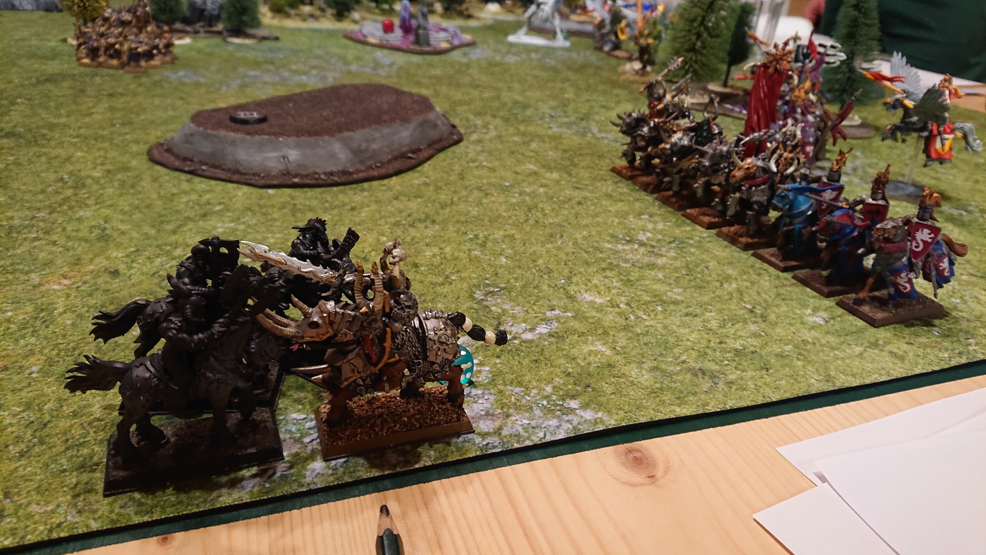 Der Beschuss der Fernkampf-Melusai auf die Pegasusreiter führte nur zu einer Wunde und würde sie wohl kaum vom Vorrücken abhalten. Die Hexenkönigin (Hag Queen) Geldriin versuchte ein Gebet an Khain, jedoch schien das Hexengebräu, dass die vor der Schlacht genommen hatte (+1 auf Verwundungswürfe) wohl etwas ihre Aussprache beeinträchtigt zu haben, so dass Khain ihr eine ordentliche Schelle und eine Wunde verpasste...