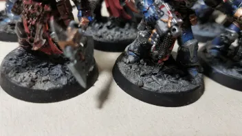 Für die Word Bearers bin ich mir nicht ganz sicher. Die machen ja generell alles und überall. Könnte ich also so lassen. Oder ich passe es den bases der anderen Armeen an, was schlauer ist, dann kann sie zusammen spielen ohne auszusehen wie ein Idiot. :D Also dunkle Farben. Matsch, Geröll, Schutt, ...