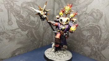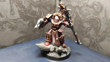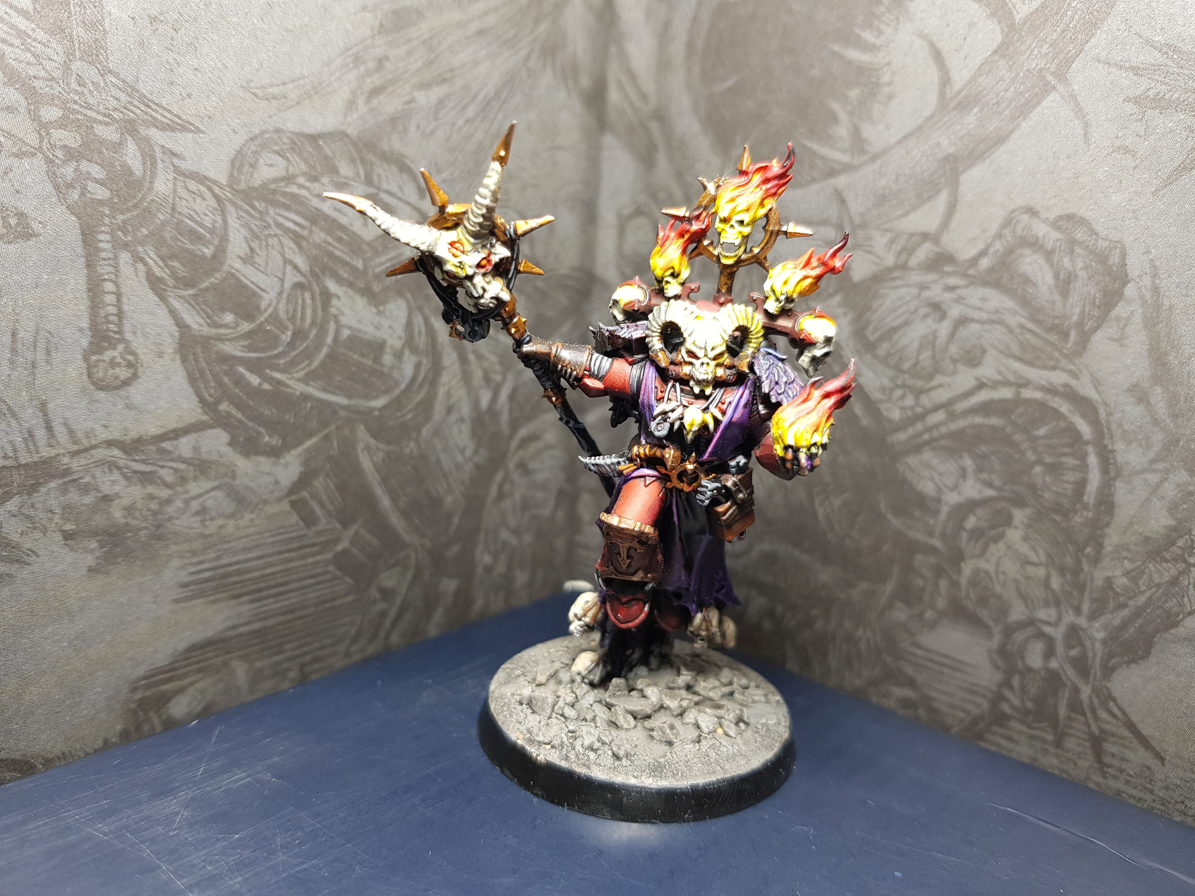 Der MoP ist schon ziemlich gelungen. Meiner Meinung nach ( die ungefähr hochgerechnet 1,5 Jahre Malerfahrung entspricht) hätte ich den Schädelhelm ggf in einem dunklen Ton bemalt und gerichtete Lichteffekte von den Flammen drauf gezaubert. Die Robe finde ich ziemlich cool ggf noch Schriftzeichen drauf malen an den Saum?? Sind ja Word Bearers die das Wort Lorgars verbreiten!