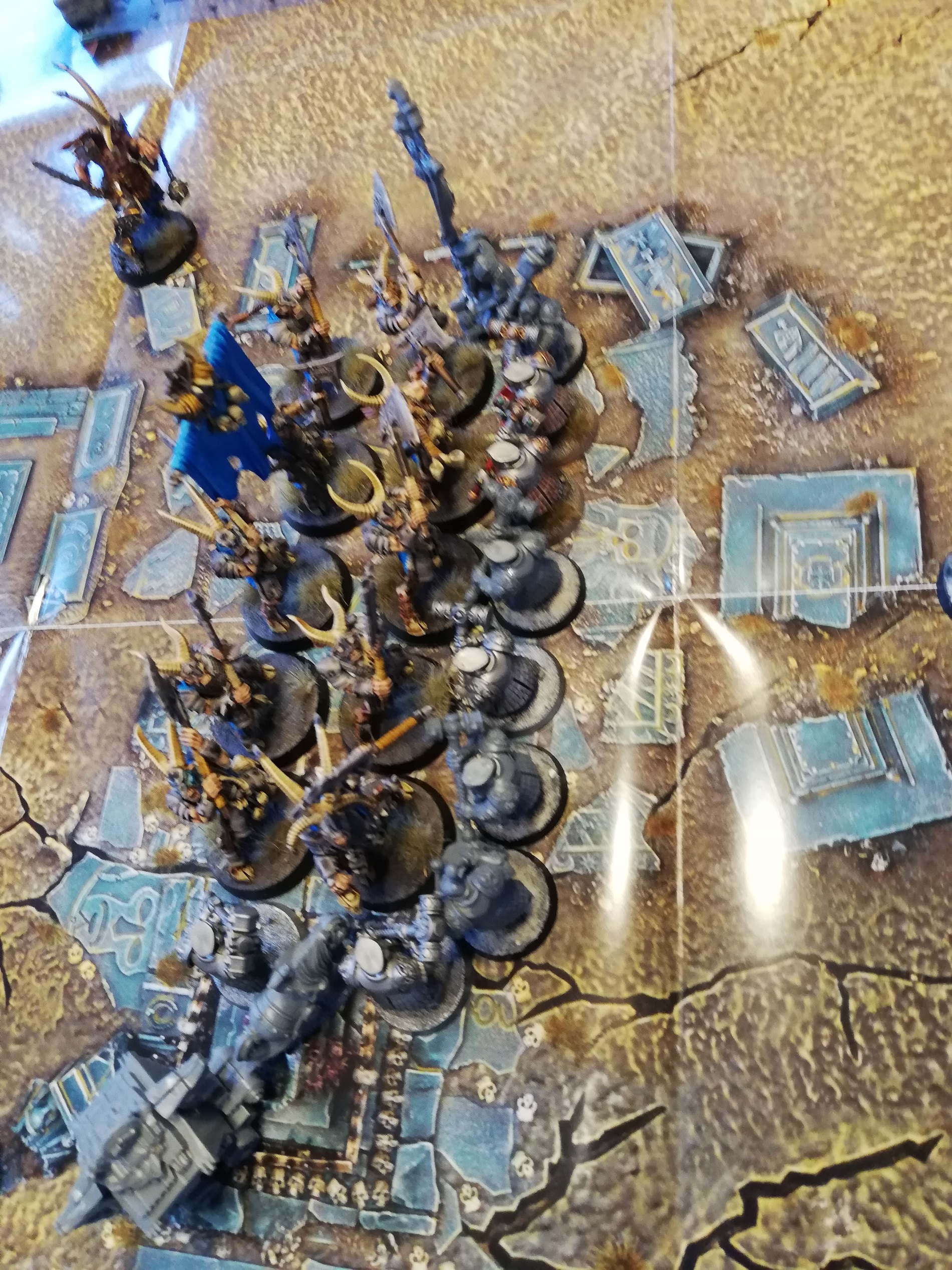 Was soll ich sagen, wir trafen aufeinander, die Bestigors versuchten im ersten Zug zu Rennen und in den Nahkampf zu kommen, allerdings versagten die Würfel... Daraufhin konnten die Hammerer Ihrerseits einen Angriff starten und schlugen dank der Befehlsfähigkeit Ihres Warden Kings mit 31 Atacken zu. Nun, 7 der Bestigors gingen , der Rest floh nach einem Misslungenen Kampfschocktest (Moraltest).