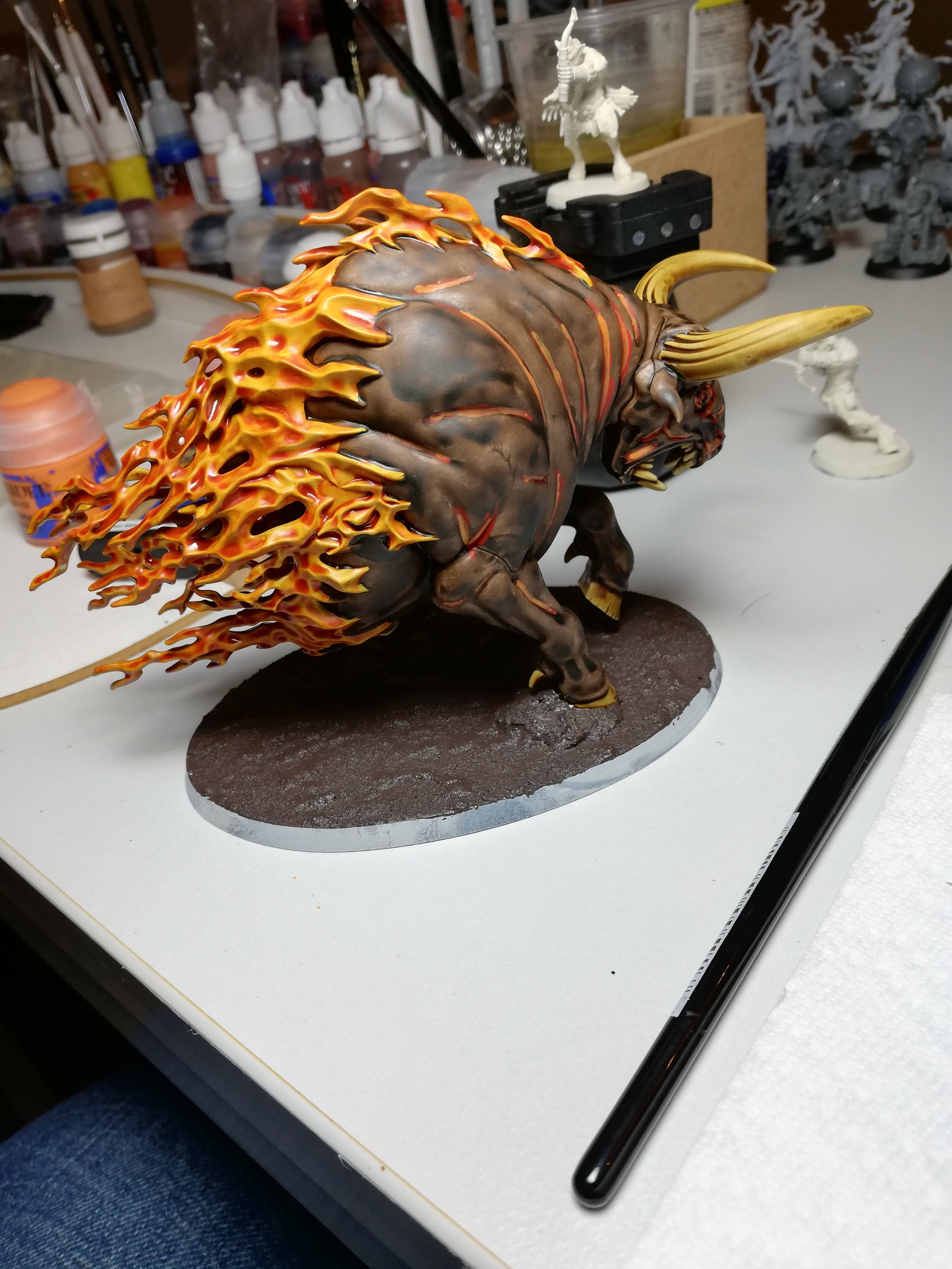 Ich habe zum einen mal zwei WIP Bilder von meinem Endloszauber, dem Wildfire Taurus, wieder habe ich mit Contrast Paints gemalt. Die Flammen werden noch bearbeitet etc.