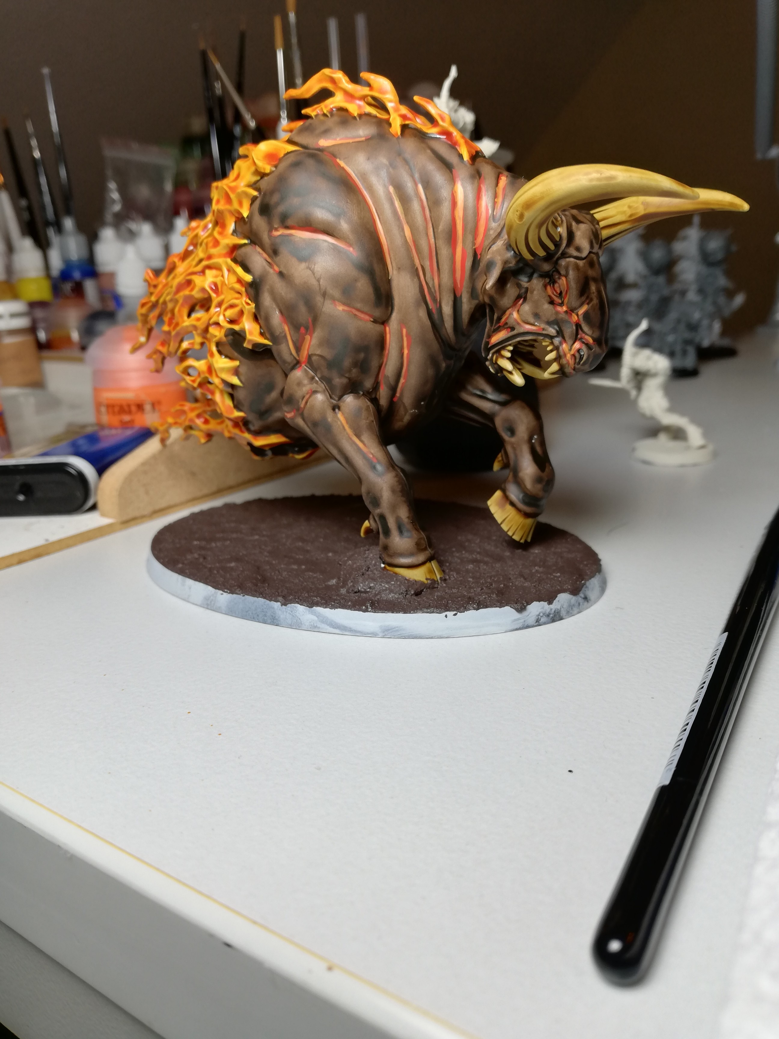 Ich habe zum einen mal zwei WIP Bilder von meinem Endloszauber, dem Wildfire Taurus, wieder habe ich mit Contrast Paints gemalt. Die Flammen werden noch bearbeitet etc.