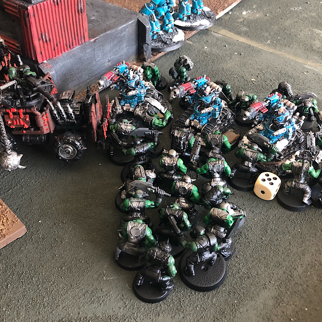 Die Orkrunde brachte in einer Art Pick Up noch einen Trupp Panzerboyz nach vorne und zusätzlich die 10 Boyz. Die Boyz und der Pick Up zerlegten meinen Kriegsherrn und banden die Destroyers im NK. Es passierte nicht mehr viel, aber wäre nochmal spannend geworden, da lediglich die Robots, der Dunecrawler, der Vindicare am Ende übrig waren.
