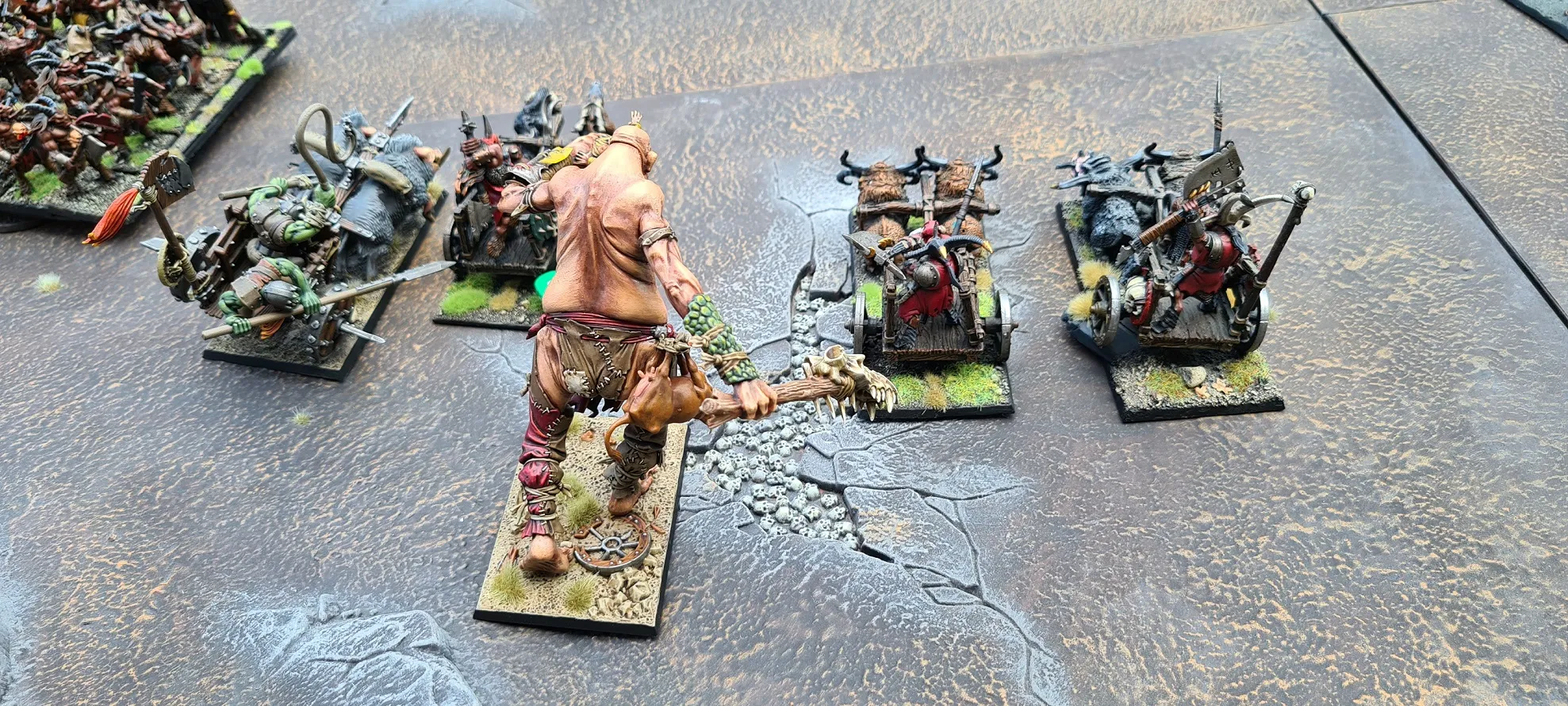 Beeindruckend auf der Gegenseite: Ein Riese marschiert zwischen den Streitwägen der Tiermenschen und Orks