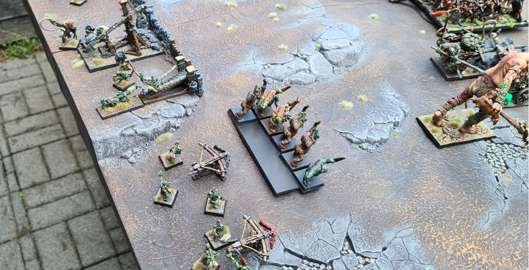 Der Riese wurde von einer Warpblitzkanone erschossen. Der Ghorgon (geproxt als zweiter Riese) metzelte sich durch die rechte Flanke und tötete unter anderem das Stegadon und die Tempelwache samt Slann gemeinsam mit den Resten der Wildorks.