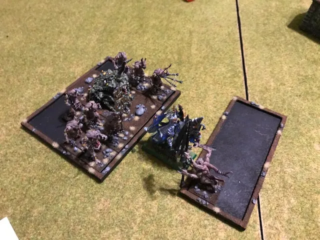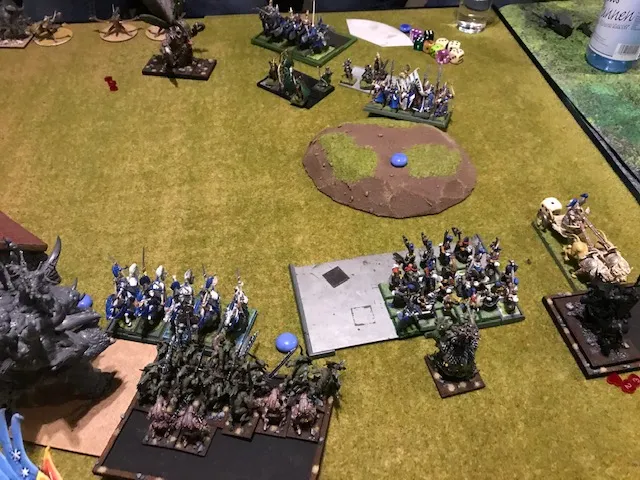 Jetzt wurde es aber ungemütlich... Nachdem meine Molochreiter einen Angriff auf eine Einheit Silberhelme verpatzt hatten, waren die schnellen Elfen zur Stelle. Heiners Angriffe schaffte er alle und war mit den Löwen in meinen Schleimbestien drin und der Löwenstreitwagen in den Molochreiter. Zusätzlich wurde ich ausgeblockt mit den Reitern... den Phönix im Rücken nicht zu vergessen...