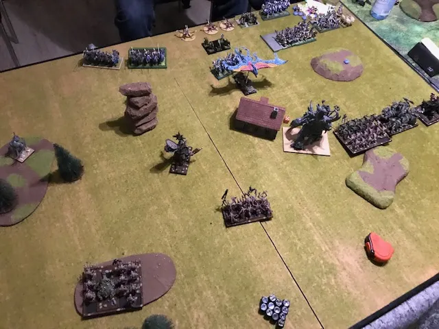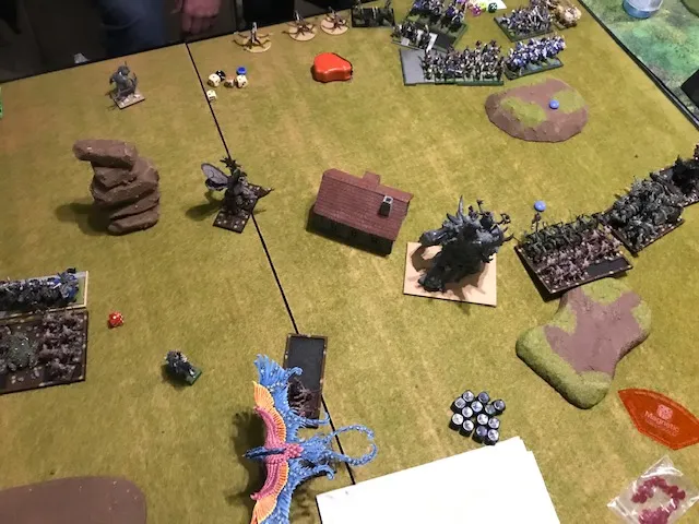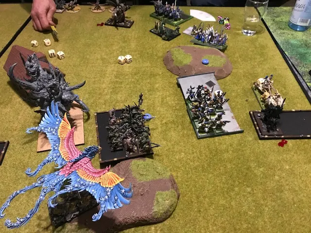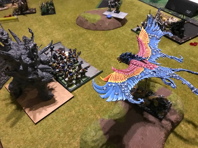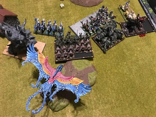 Wie man unten sieht, konnte der Feuerphönix meine Einheiten überfliegen und dezimierte meine Horrors erheblich. Mein Blutdämon sagte seinen ersten Angriff an, aber die Elfenreiter wählten lieber die Flucht, sodass ich nur langsam mich vor die Speerschleudern platzieren konnte...