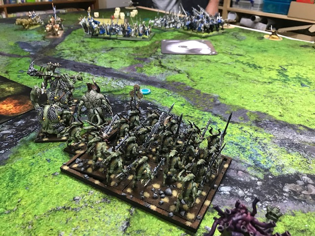 Im Endeffekt war es einfach nur Glück für ihn, dass die Speerschleudern so schlecht im Treffen waren. So ist das mit dem Beschuss... hier hatte ich das Glück, aber ich weiß noch beim Spiel gegen Starspielers Hochelfen wurde er einfach von Bögen erschossen, weil er richtig viele sechser beim Verwunden hatte. Da war dann das Glück auf der Seite der Elfen. (In dem Spiel hatte ich noch nicht den 5er Rüstungswurf dabei, vielleicht hätte er dann eine Runde länger gelebt)
