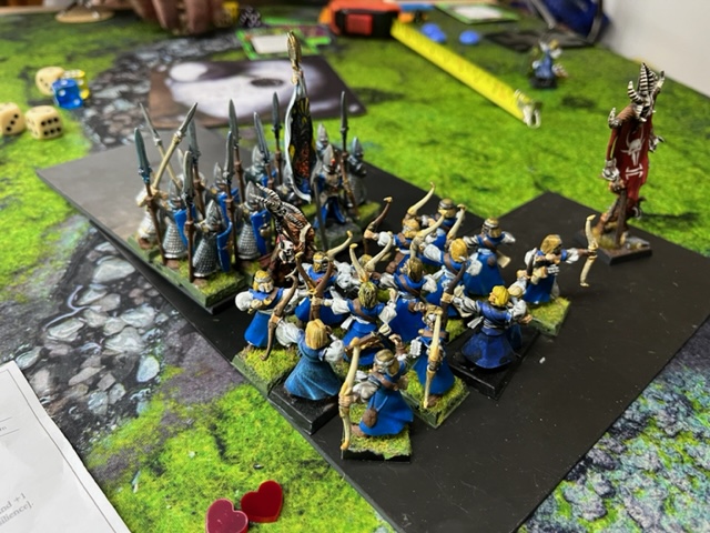 Mehr Respekt hätte ich aber vor den Bogenschützen haben sollen... 8o  heiner hat es ja schon oben angedeutet. Die Bogenschützen geben alles. Einen Leben hatte der Gortach durch Magie verloren und dann fallen weitere 5 Sechsen bei dem Bogenbeschuss und weg war das Monster. Dann noch etwas Beschuss vom Helden und einem Volltreffer von der Speerschleuder und weitere 5 Leben beim anderen Gortach sind weg. Was für ein Start ins Spiel... Ab dem zweiten Spielzug spielen die Tiermenschen mit 960Punkten weniger, den der zweite Gortach kann nur noch weglaufen...