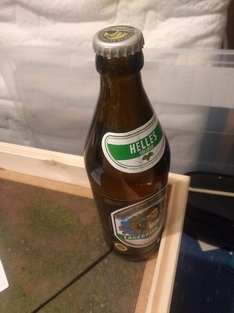 Bier als Gewicht zum Beschwerung der Trennlinie für die Aufstellung "Refused Flank". Wir spielen die Mission "Capture the Flags", also Scorer töten. Wird ein spaßiges Spiel gegen Marcos Beast Herds. 😄