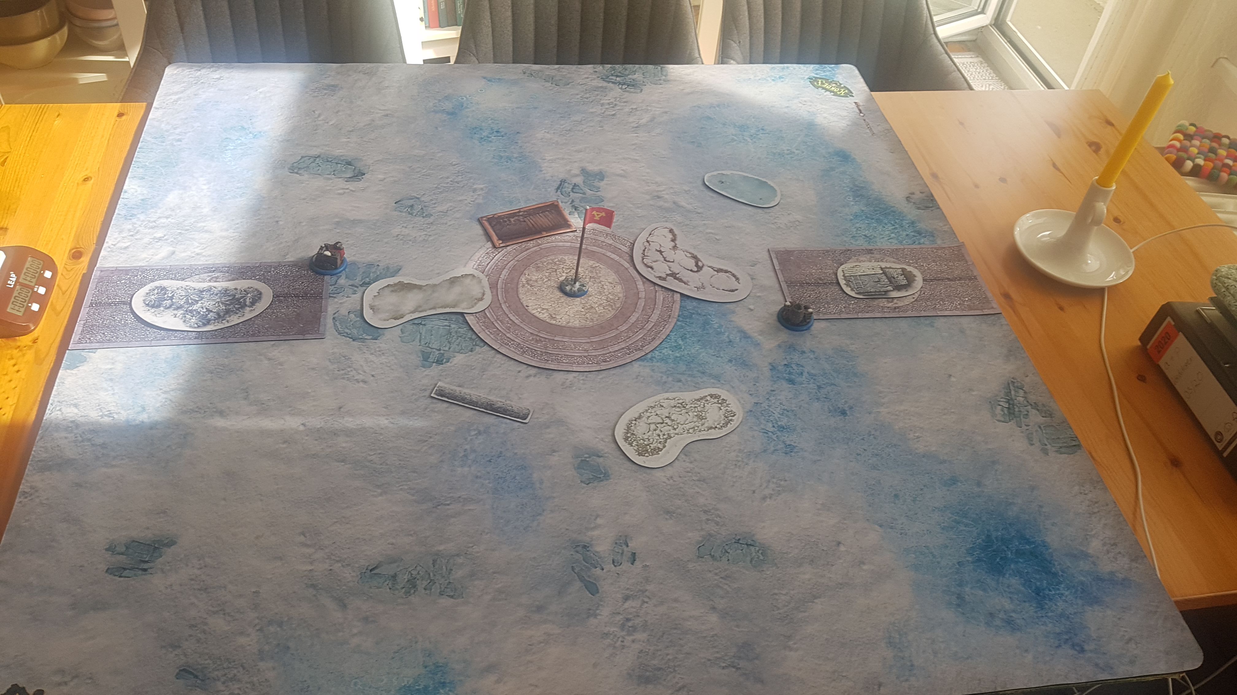 Mark two rectangular zones (6˝ × 12˝), one circular zone (12˝ diameter), and place one flag and two objectives in accordance with the diagram below. Starting on the second player’s second turn, at the end of each player’s turn, a player earns control points (CP) as follows: