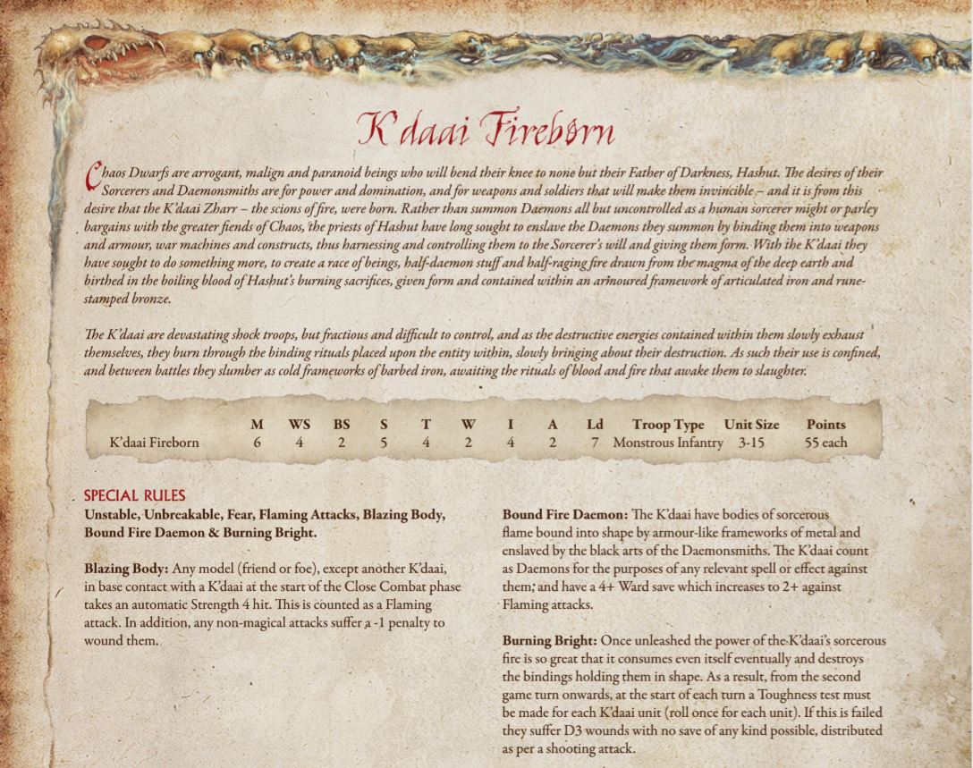 Kann schon sein, dass es die K'daai in Deinem Online Codex nicht gibt. Forge World hatte aber ja Modelle für die K'daai und somit haben sie auch Regeln für sie zur Verfügung gestellt. (Siehe unten im Anhang.) Die Frage ist eben nach welchem Buch bzw. welchen Regeln Du spielen willst. In Tamurkhan sind auch noch andere speziellere Einheiten drin die es sonst so nirgends gab.