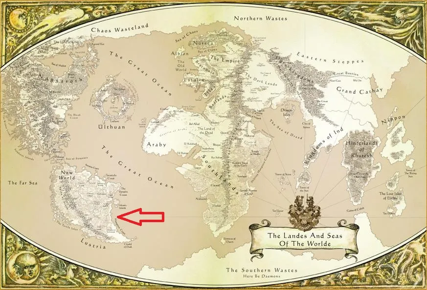 Auch hier wieder die Karte der Alten Welt mit einem dezenten roten Pfeil, der die Suche nach den Norse etwas erleichtern soll. Die Norse leben in Norsca, mal schauen, ob ihr es entdecken könnt: