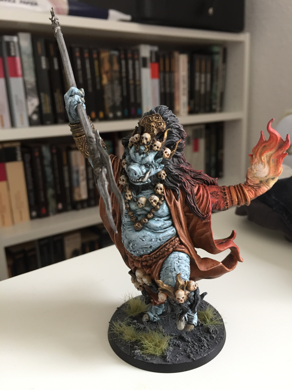 2. Meistens klappt es nicht sonderlich gut wenn man eine Mini fertig malt und dann den OSL effekt oben drauf. Was ich meine ist, wenn du z.b ein dunkles blaubraun nimmst für die Robe des Schweinepriesters, kannst du die OSL stellen schon mal mit einem dunkelrot vormalen damit du im Malprozess schon erkennst ob die Lichteffekte weit genug gehen. Außerdem sparst du Zeit beim layern.