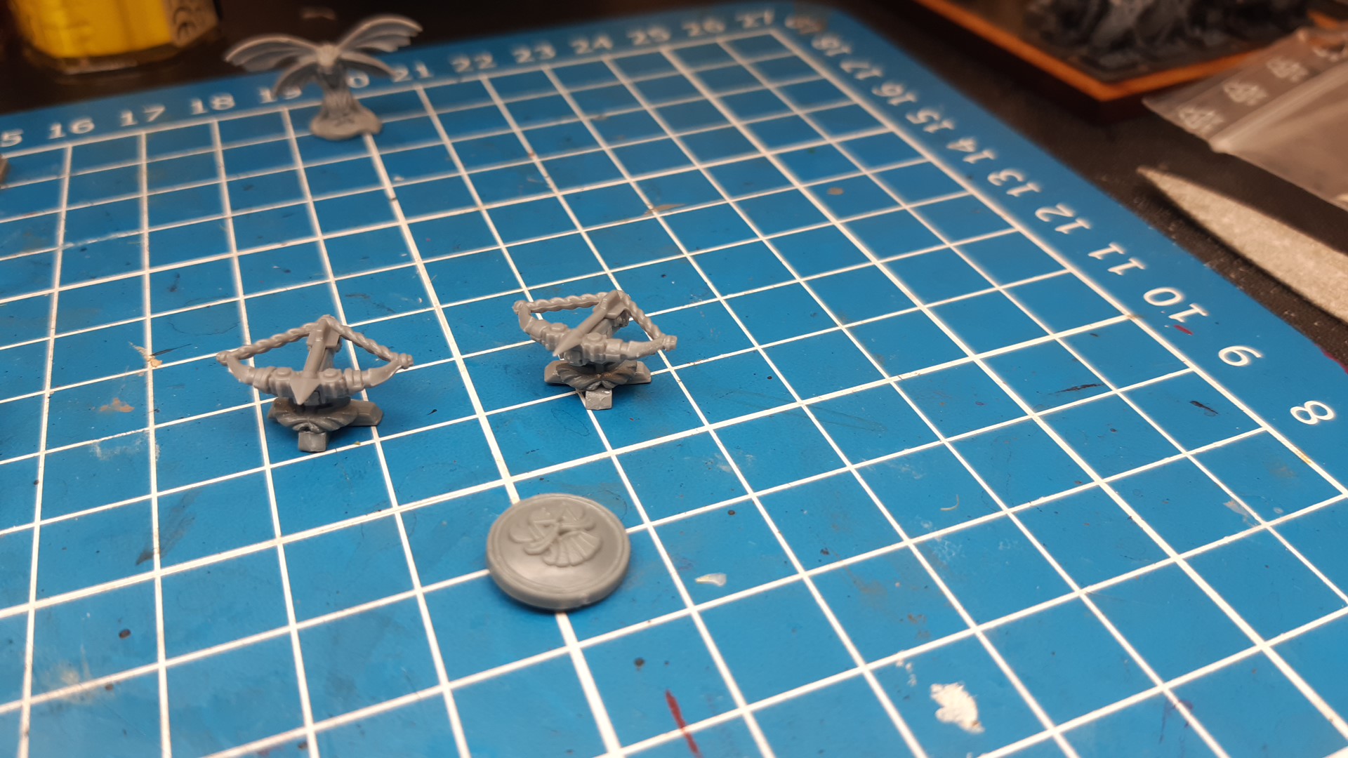 Die Armbrust dann auf den Sockel der Feuerkörbe der bretonischen Bogenschützen geklebt und final noch eine Gesichtsmaske der Langbärte ein wenig gekürzt und als Verkleidung genutzt.