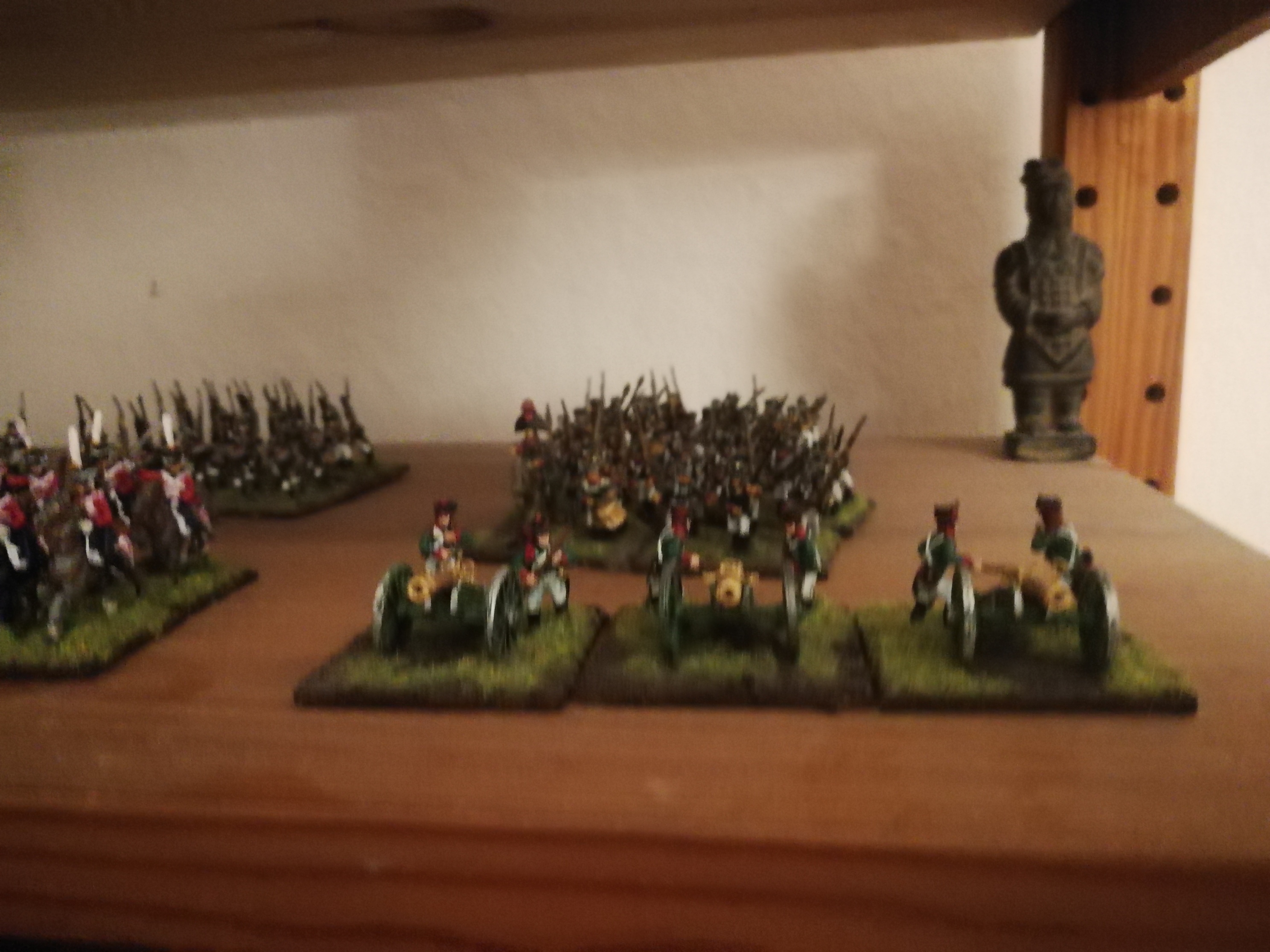 (Hihi, der Hobbyhistoriker in mir kann es nicht lassen. Ich spiele eine "Field of Glory: Napoleonisch" Armee der Russen in 15mm. Vor einiger Zeit habe ich ein paar Antestspiele bei einem Bekannten gemacht und es hat mir richtig gefallen. Ziemlich kompliziert, Mensch gegen Mensch, Artillerie gegen Artillerie, Zentimeter um Zentimeter (Werst um Werst). Ich habe vor es weiter zu vertiefen und zumindest auf 800 Punkte (Standardgefechtsgröße, entspricht etwa einem Korps) angemalt zu kommen. Jetzt bin ich etwa bei 400. Die Regeln gibt es mittlerweile in der 2.0Version)