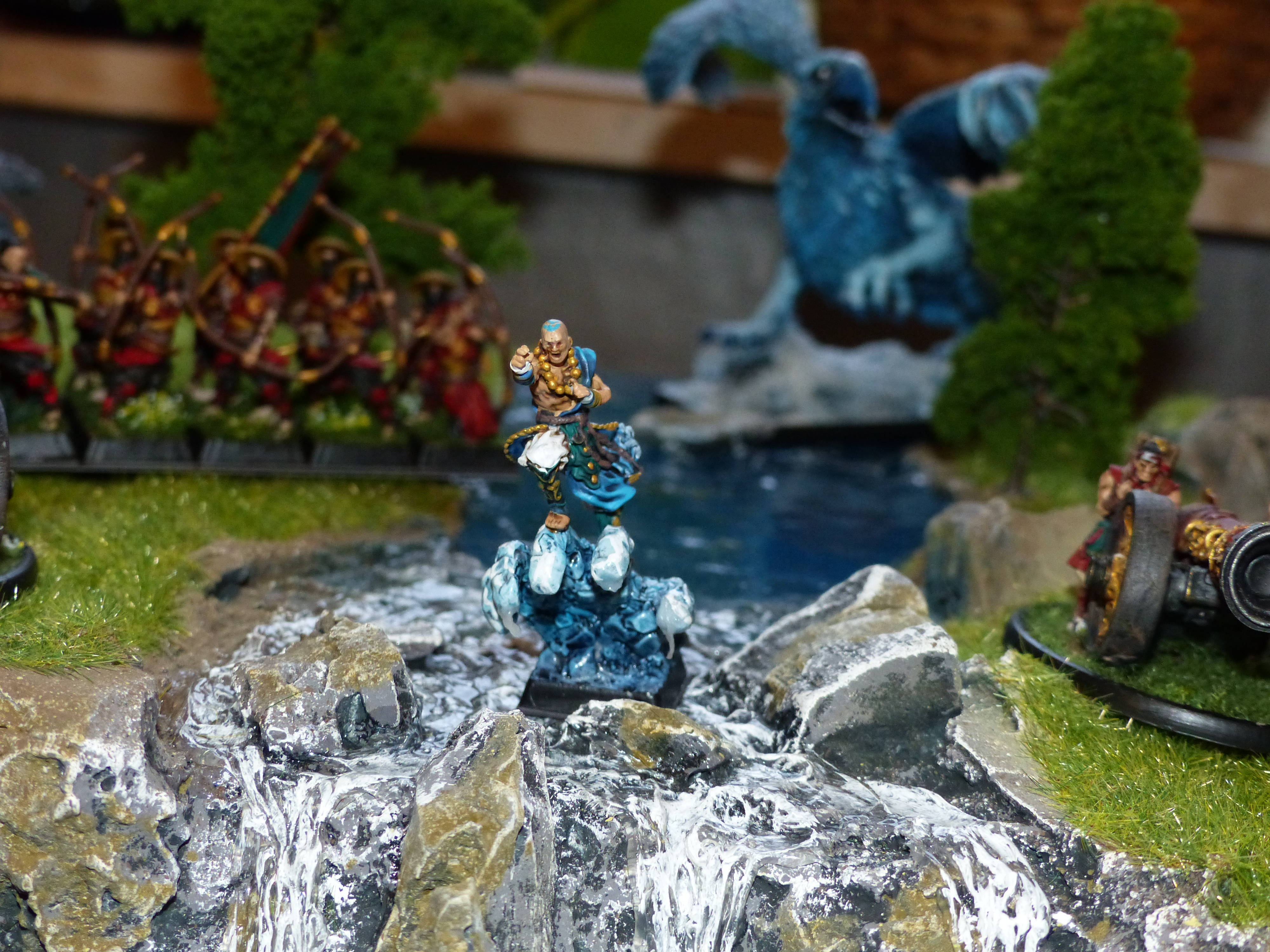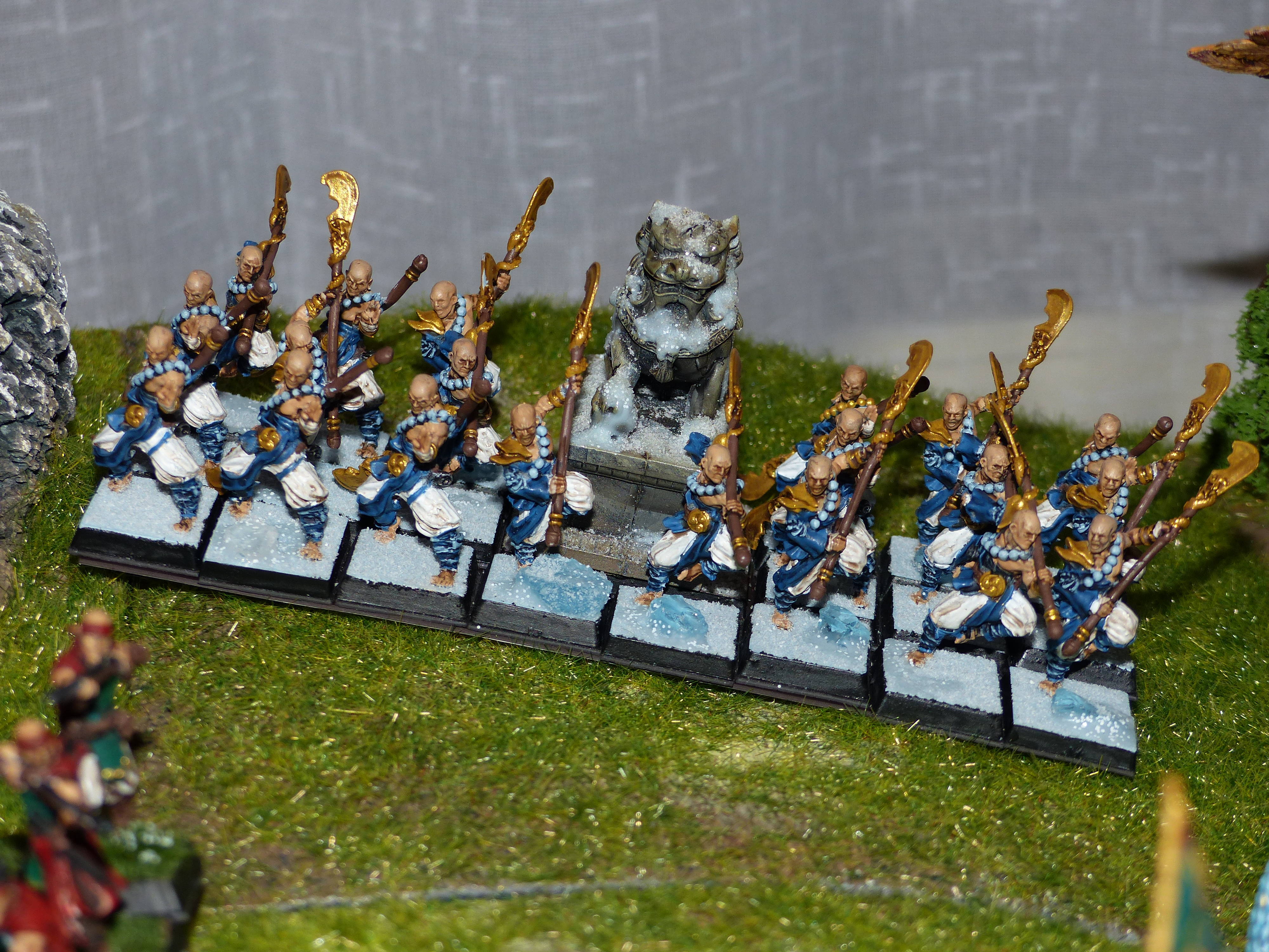 Ich habe diese asiatische Armee als Hochelfen für The Ninth Age geplant. Die Ritter von Ryma (früher Drachenprinzen) reiten hier auf echten Drachen, die Flammenhüter (früher Phönixgarde) sind Feuermönche, die Lion Guard (Weiße Löwen) Eismönche, die Schwertmeister Samurai und die Königinnengarde (Schwestern von Avalon) Geishas. Besondere Freude habe ich an den beiden Sky Sloops, die von Heißluftballons getragen auf Wellen reiten. Für die Wellen danke ich Arrahed .