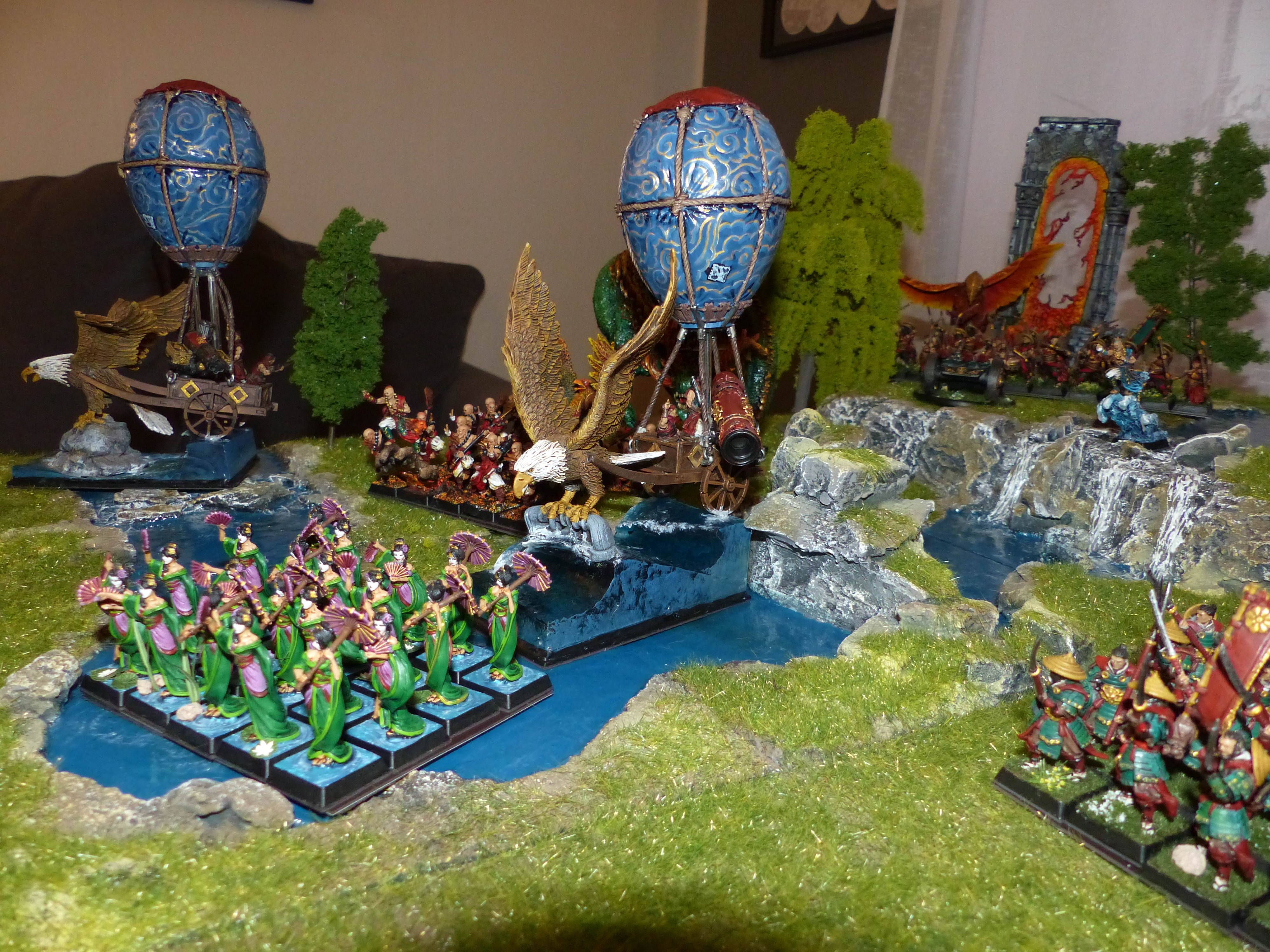Ich habe diese asiatische Armee als Hochelfen für The Ninth Age geplant. Die Ritter von Ryma (früher Drachenprinzen) reiten hier auf echten Drachen, die Flammenhüter (früher Phönixgarde) sind Feuermönche, die Lion Guard (Weiße Löwen) Eismönche, die Schwertmeister Samurai und die Königinnengarde (Schwestern von Avalon) Geishas. Besondere Freude habe ich an den beiden Sky Sloops, die von Heißluftballons getragen auf Wellen reiten. Für die Wellen danke ich Arrahed .