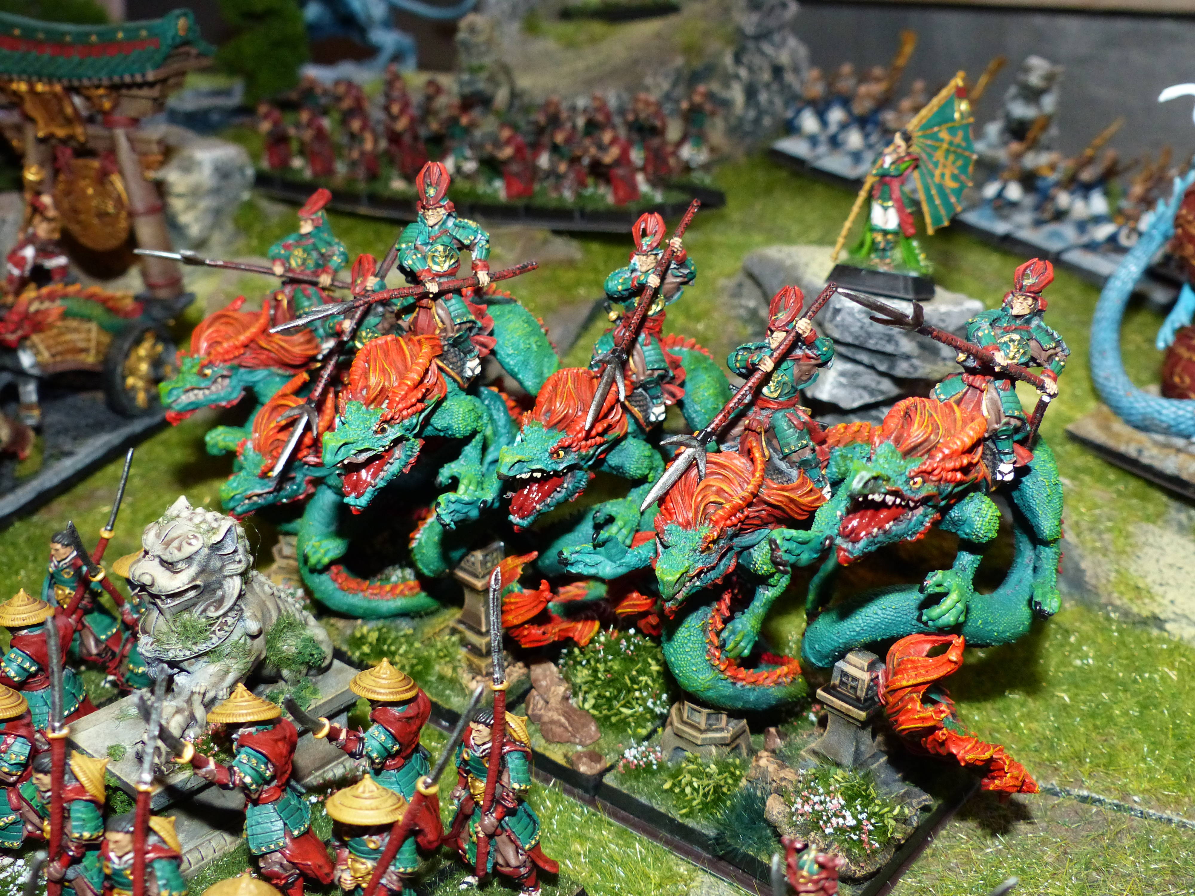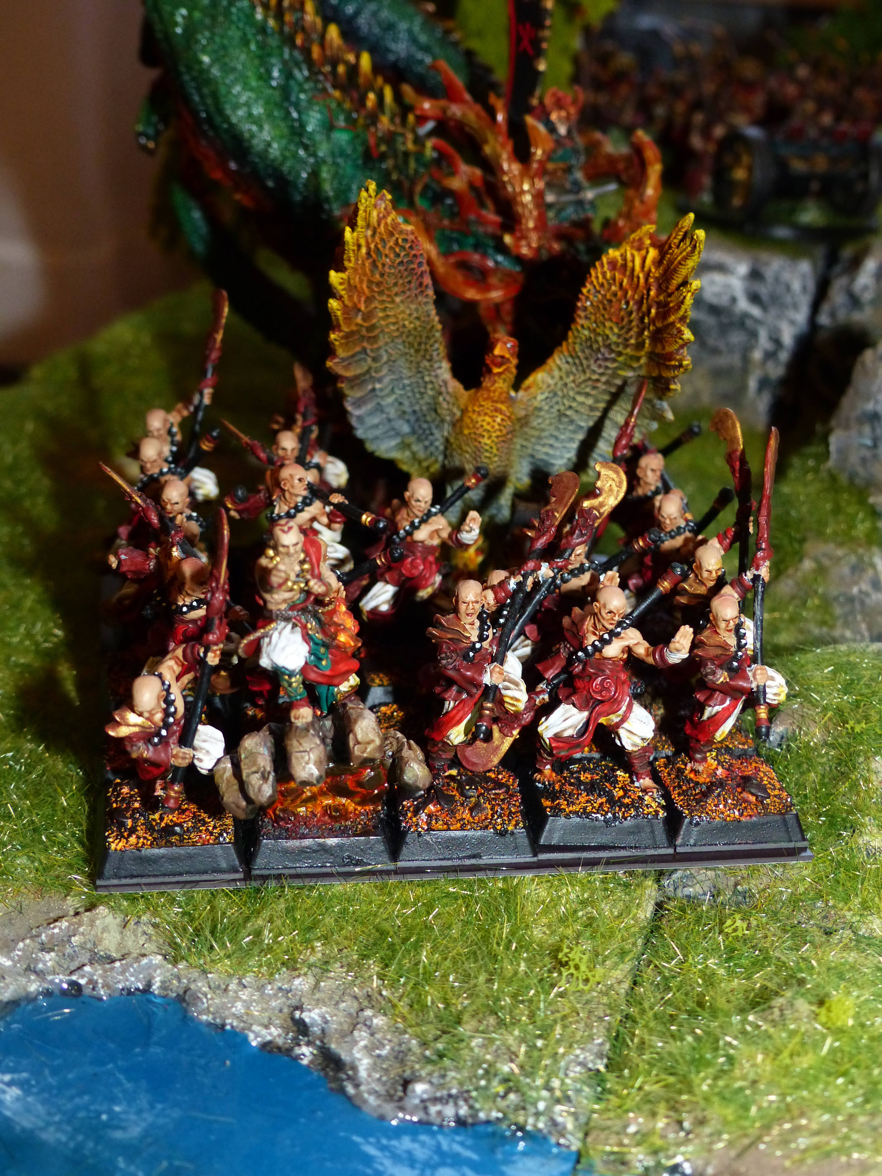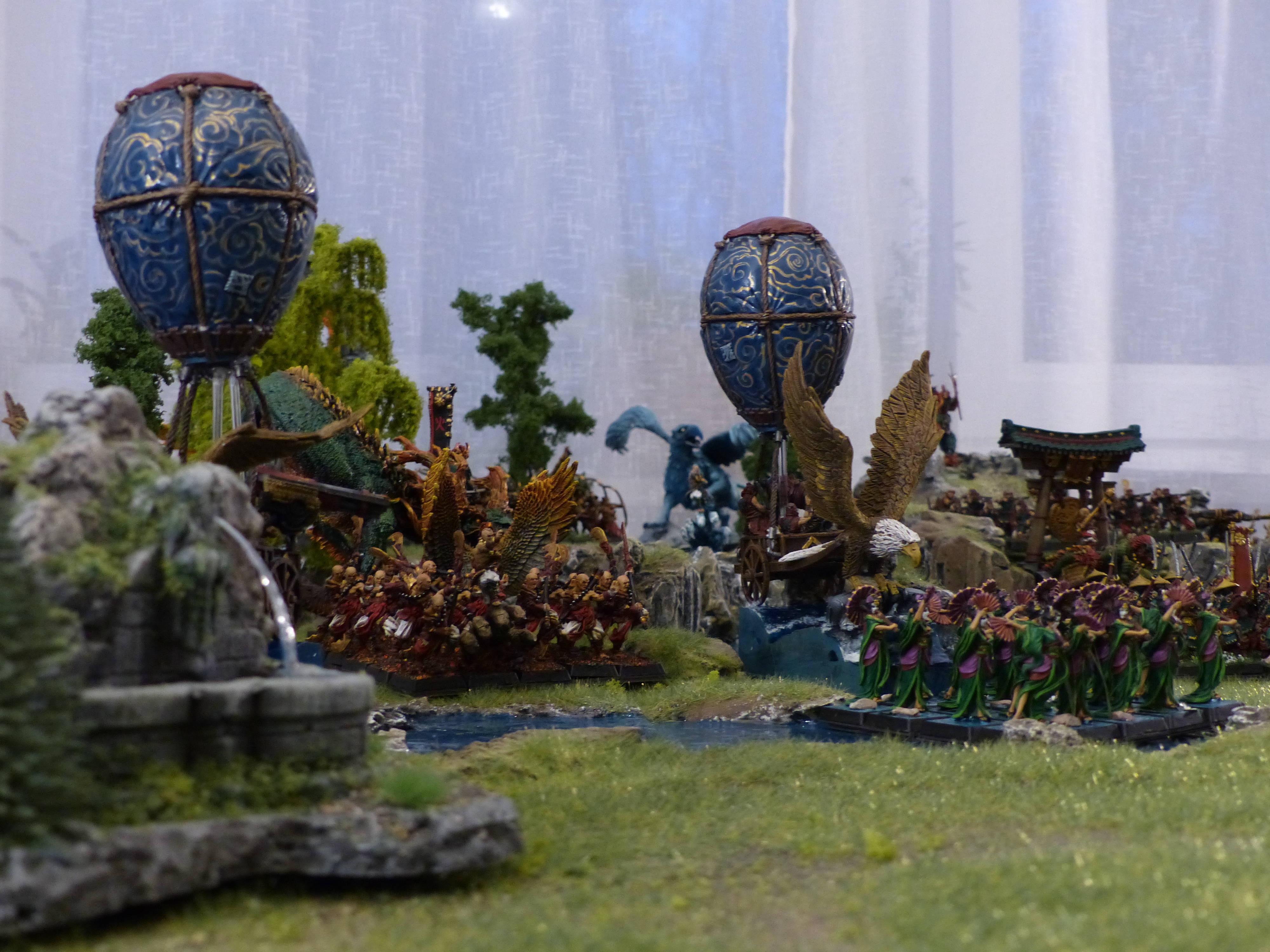 Ich habe diese asiatische Armee als Hochelfen für The Ninth Age geplant. Die Ritter von Ryma (früher Drachenprinzen) reiten hier auf echten Drachen, die Flammenhüter (früher Phönixgarde) sind Feuermönche, die Lion Guard (Weiße Löwen) Eismönche, die Schwertmeister Samurai und die Königinnengarde (Schwestern von Avalon) Geishas. Besondere Freude habe ich an den beiden Sky Sloops, die von Heißluftballons getragen auf Wellen reiten. Für die Wellen danke ich Arrahed .