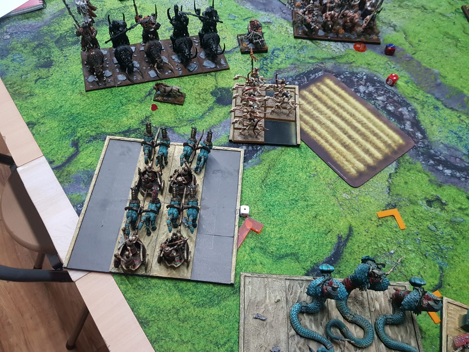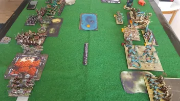 Das wesentlich ist schnell erzählt. Er sagt mit allen Einheiten außer den Gnoblars einen Angriff auf die Streitwägen an. Also Tusker und Tiger in die Front, Hunter und Bus in die Flanke.