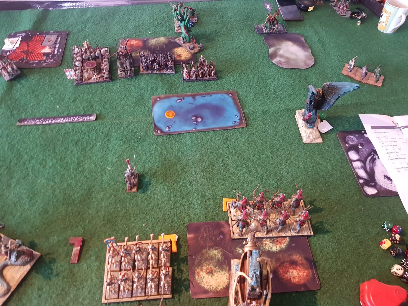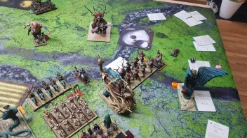 ). Besonders gefährlich sind hier für mich die beiden Hunter, da sie jeweils Vorhut haben und mit ihrer kleinen Base sowie Geschwindigkeit meinen Magierbunker bedrohen können. Besonders der Hunter mit dem Aegis 4+ war aber ein gutes Ziel für meinen Pharao. Das Auroch ist im Angriff sehr gut, hier wollte ich gerne mit der Sphinx rein, bei der zwar die W3 Wunden halbiert werden, die aber dennoch nur auf die 5 bzw. 6 verwundet wird. Die Tusker Calvery finde ich großartig. Sie ist schnell und mit Widerstand 5 auch widerstandsfähig gegen leichten Beschuss oder Magie. Dazu natürlich Scoring.Aufstellung war hier Diagonal (die 5), während das Szenario Spoils of War (die 3) vorgab. Mit Kriegsbeute sammeln kennt sich der gemeine Oger ja aus. Kein Wunder also, dass Jones hier Vorteile hatte. Wenigstens durfte ich anfangen.