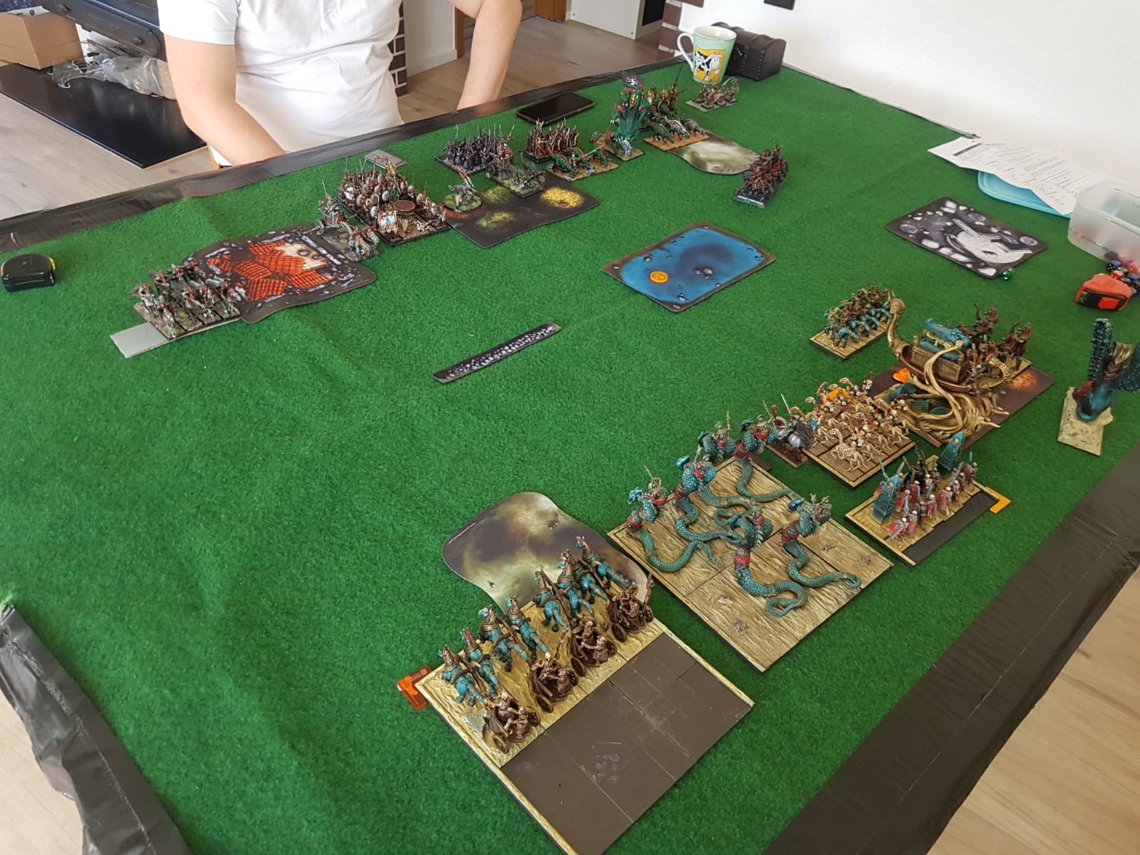 Noch eine Info: Wundert euch bitte nicht, wieso da auf meiner Seite ein paar imperiale Modelle auf der Platte stehen. Ein paar Sachen sind noch im Bau. Die 5 Pistoliere ganz hinten sind 5 Scouts. Der imperiale Ritter in der Mitte ist der Pharao. Und die Bogireiter, die seine Einheit bilden, sind eigentlich Lanzenreiter.