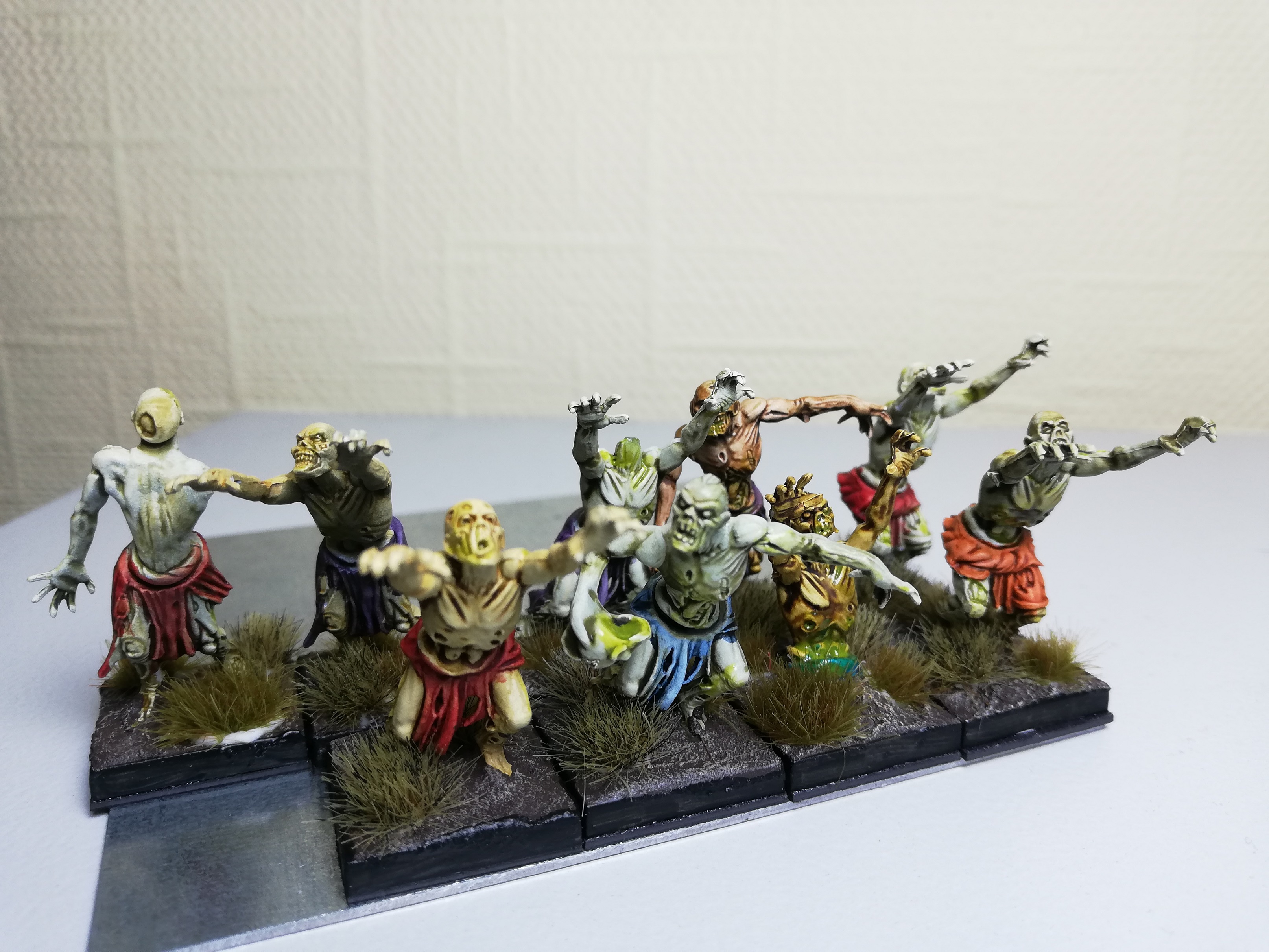 Zum einen sind nun meine 20 Skelettkrieger fertig geworden, zum anderen habe ich mit den Zombies begonnen, die ich ganz schlicht mit Shades und Contrastfarben bemalt habe. Zudem seht Ihr hier den Nekromanten, welcher auf Farbe wartet und schonmal zur Probe in den Zombies Platz nimmt. Um welches Modell es sich handelt kann ich leider nicht sagen, da ich Ihn in der Armee mit erworben habe.