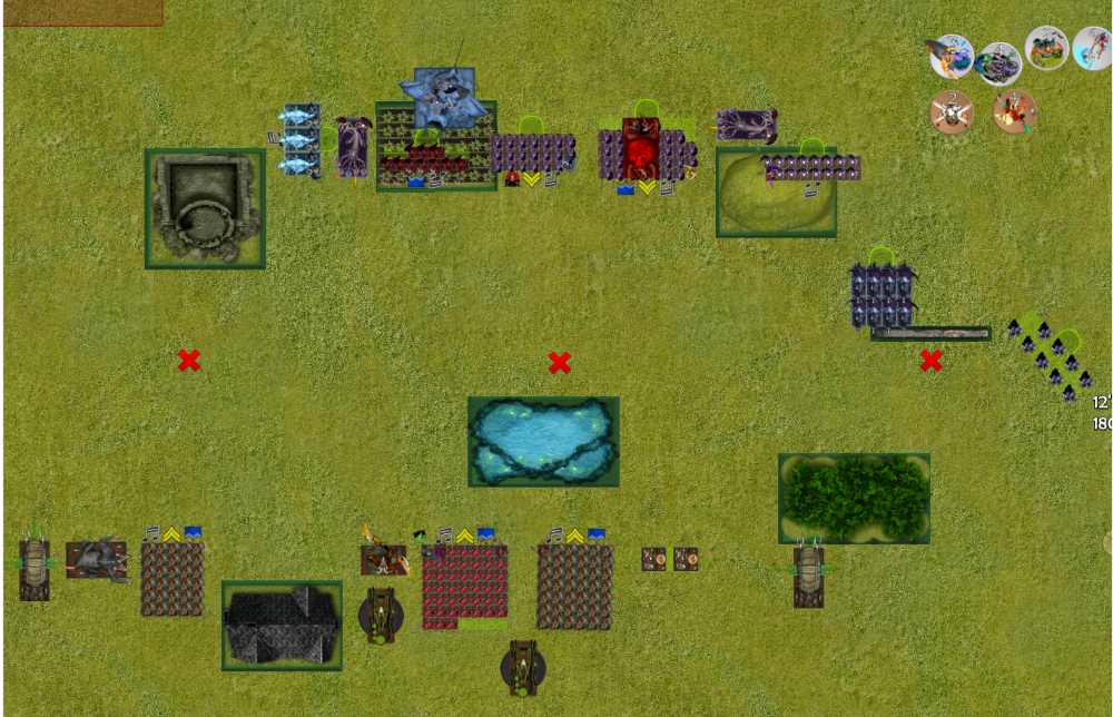 In der Mitte hat er wenig Rückzugsmöglichkeiten. Aber ehrlich gesagt versucht er auch nicht diese zu Nutzen. Da greif ich ihn dann einfach an und grinde seinen Kram weg, die zweite Hydra tankt den Rattendämon eine Runde, danach kommen die Speerträger dazu und fordern den Weg damit der Dämon durchs Kampfergebnis wegplatzt. In dem Moment gibt mein Gegner auf.
