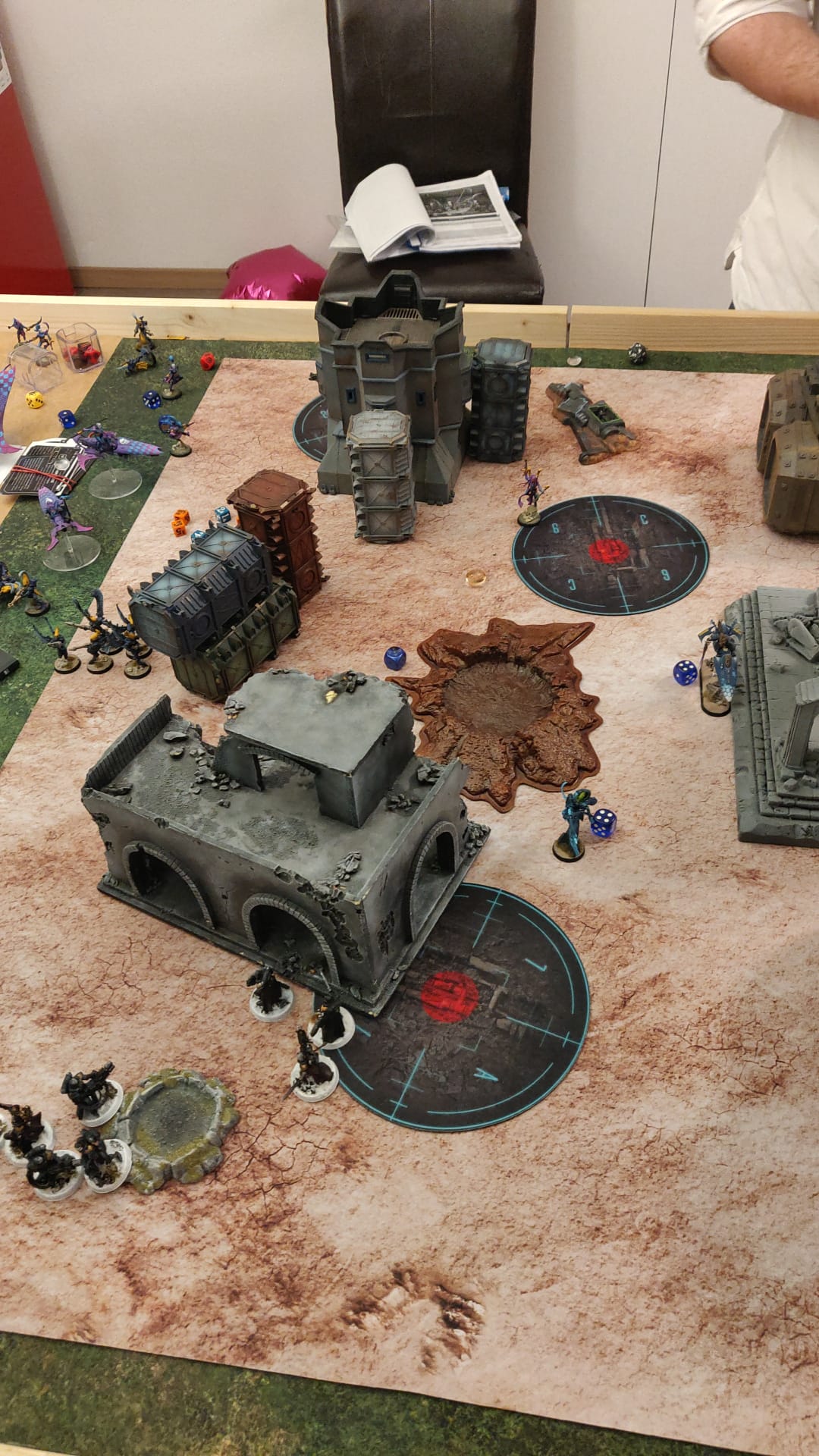 Gestern gegen Matthias gespielt, der einer der wenigen Leute bei 40k, die ich außerhalb von Vereinsmitgliedern im Handy gespeichert habe. War unser drittes Spiel und er kam nach Tau und Orks mit Deathwatch (Veteranen der Space Marines aus allen Chapters, die gegen Xenos [Drukhari, Necrons, Orks, Tau, Tyraniden sowie Aeldari also meine Craftworld und Harlequins] eingesetzt werden. Besonderheit sind, dass die Einheiten jede Runde andere Fähigkeit der üblichen Chapters geben können und Einheiten mischen können (Termis, Jumppack Marines, sogar Bikes).