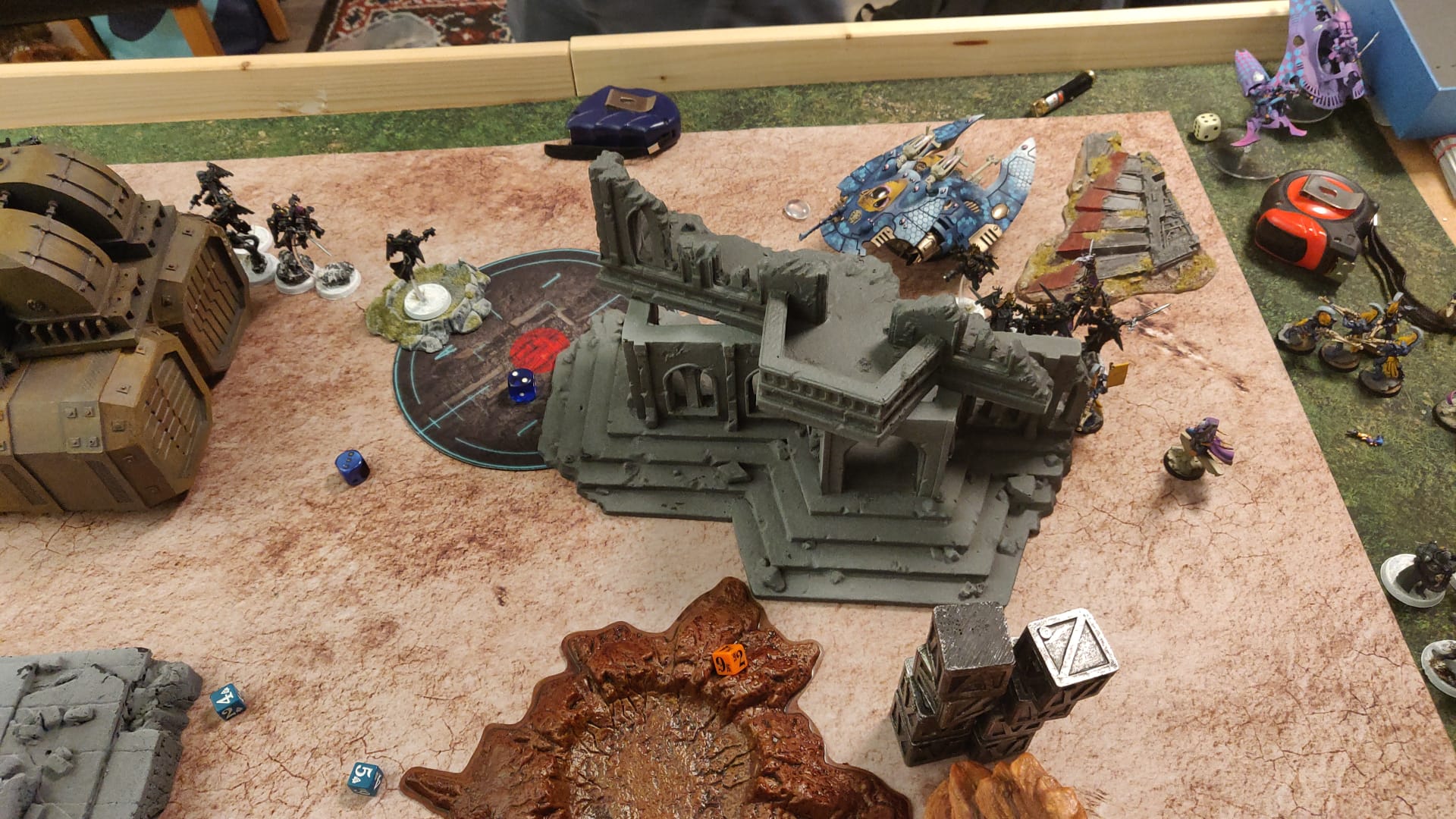 Gestern gegen Matthias gespielt, der einer der wenigen Leute bei 40k, die ich außerhalb von Vereinsmitgliedern im Handy gespeichert habe. War unser drittes Spiel und er kam nach Tau und Orks mit Deathwatch (Veteranen der Space Marines aus allen Chapters, die gegen Xenos [Drukhari, Necrons, Orks, Tau, Tyraniden sowie Aeldari also meine Craftworld und Harlequins] eingesetzt werden. Besonderheit sind, dass die Einheiten jede Runde andere Fähigkeit der üblichen Chapters geben können und Einheiten mischen können (Termis, Jumppack Marines, sogar Bikes).