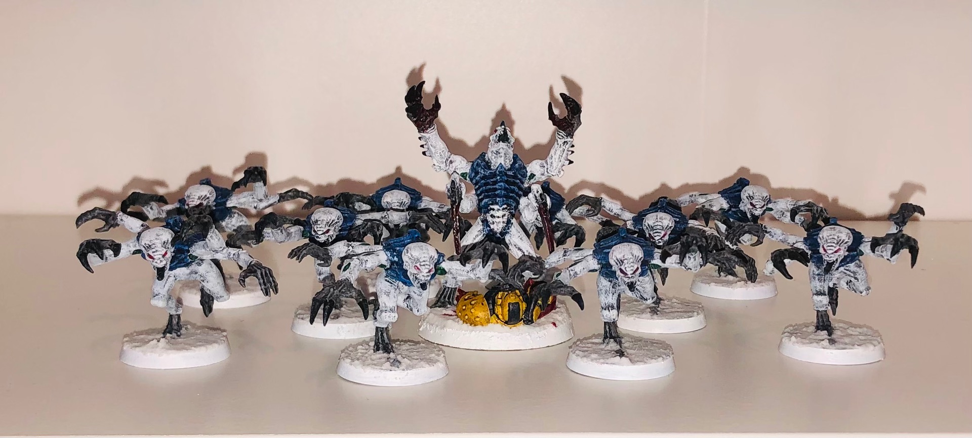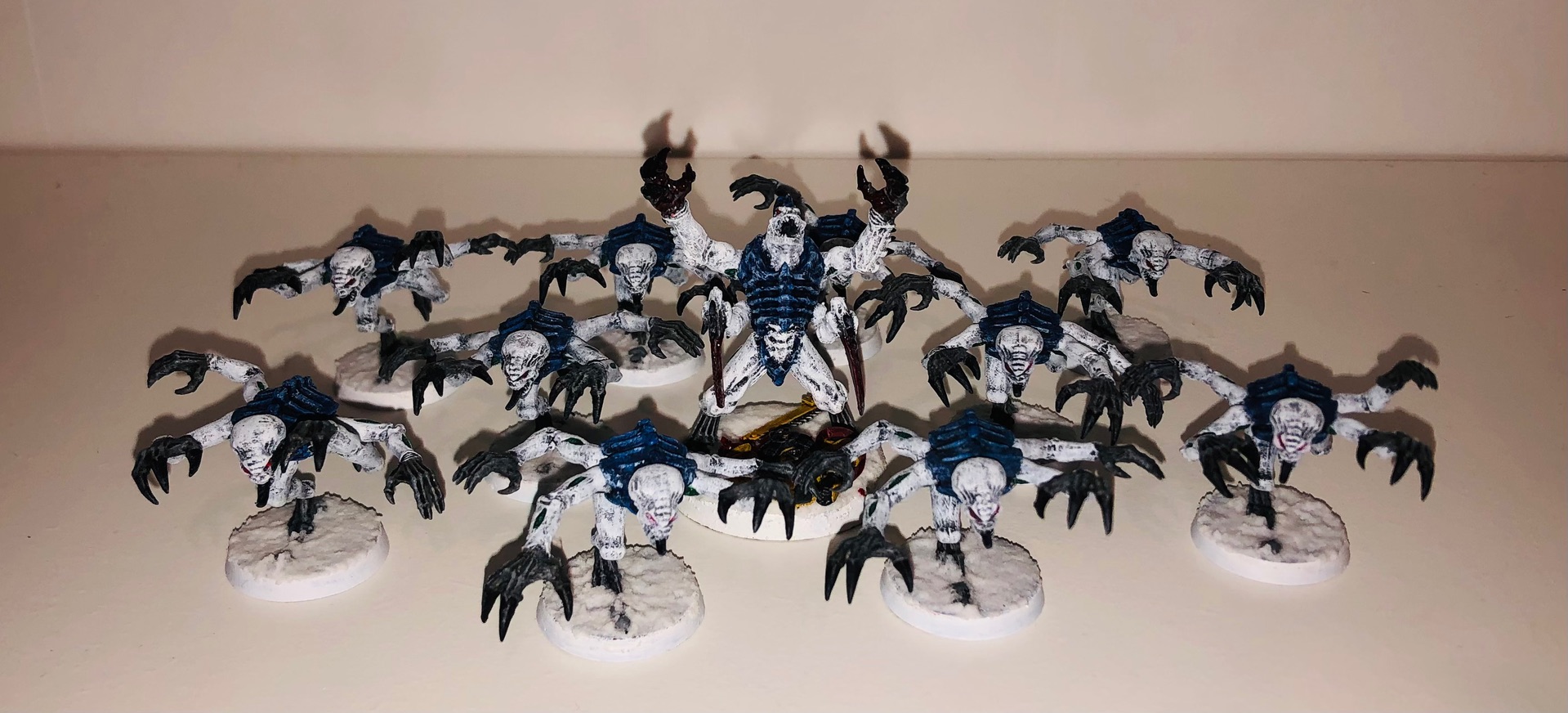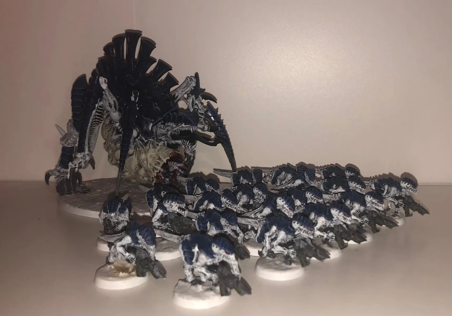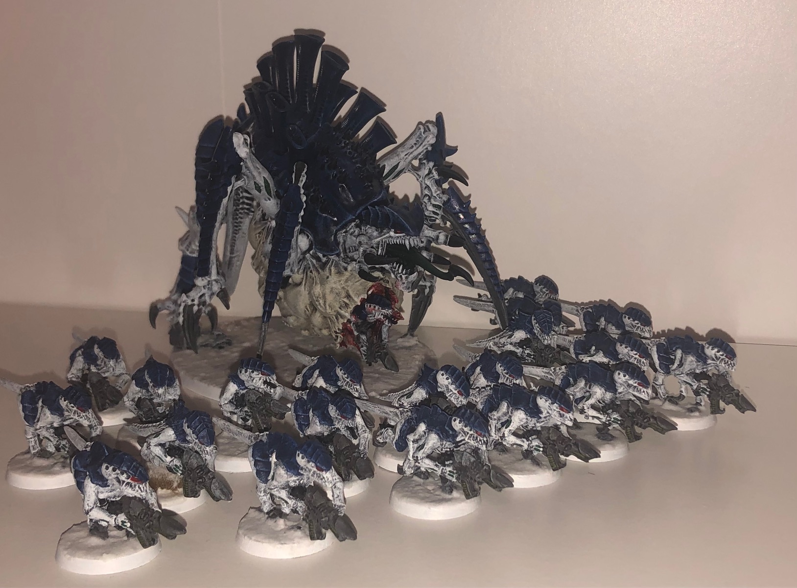 Mir hat der Einwand von Grimgorki sehr geholfen, dass man bedenken sollte, wie das Farbschema bei großen Modellen aussieht. Daher stehen zur Zeit drei Schwarmflotten im Kurs, bei denen eine gewisser Kontraststärke vorhanden ist: Kraken, Leviathan und Mara