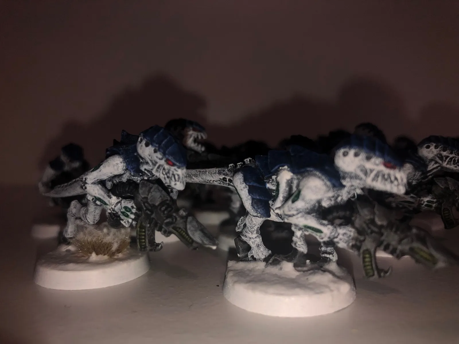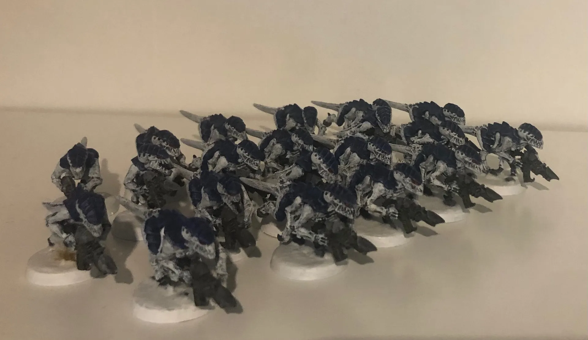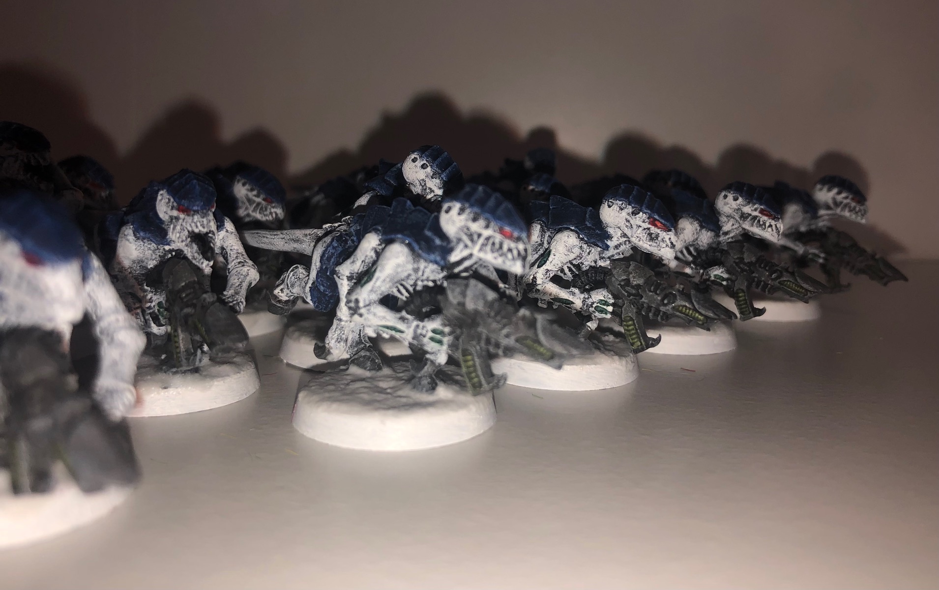 Mir hat der Einwand von Grimgorki sehr geholfen, dass man bedenken sollte, wie das Farbschema bei großen Modellen aussieht. Daher stehen zur Zeit drei Schwarmflotten im Kurs, bei denen eine gewisser Kontraststärke vorhanden ist: Kraken, Leviathan und Mara