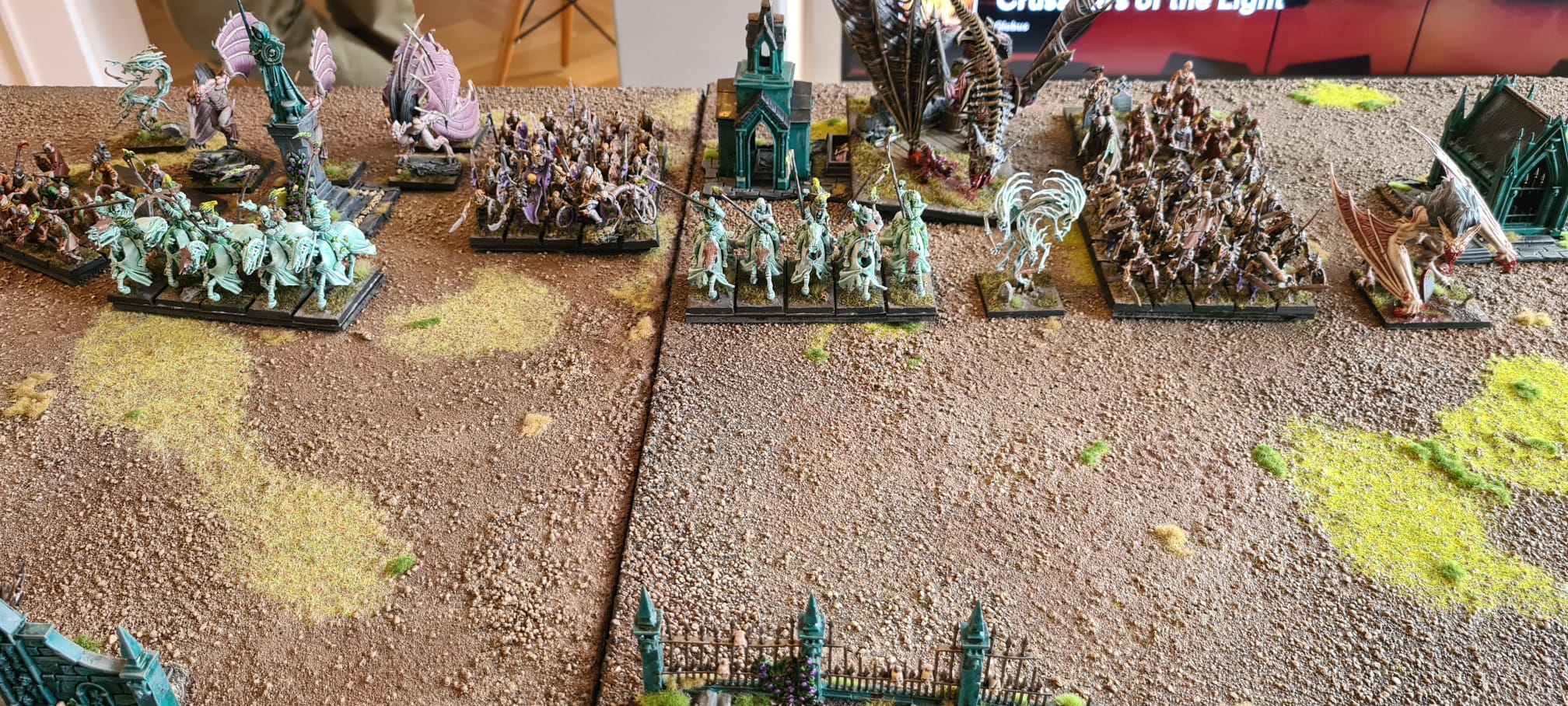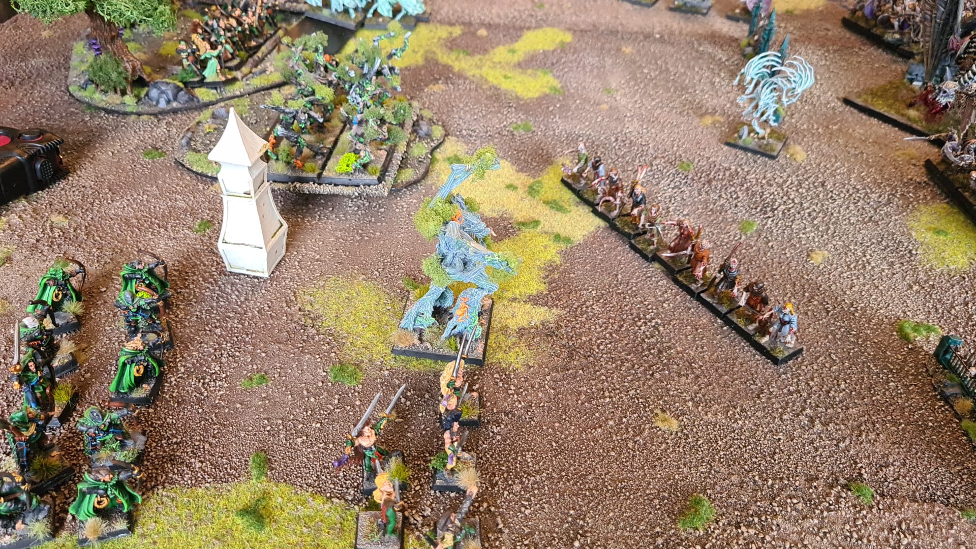 Nun erschienen die Waldbewohner am Rande des Waldes. Aus dem Wald erklang ein Horn. Ihm folgte eine Pfeilsalve nach der anderen, je doch ohne großen Schaden anzurichten. Die Schwadronen der Sensenreiter hielten auf die Krieger der Ewigen Garde zu. Dabei ritten sie unaufhaltsam durch Mauer, die jeden Sterblichen gehindert hätten, seinen Weg fortzusetzen. Sie prallten auf die Krieger, die nicht wussten, wie ihnen geschah. Gegen so einen Feind, den sie mit ihren Speeren nicht verwunden konnten, kämpften sie noch nie. Immer mehr vielen den Sensen der Reiter zum Opfer. Am Ende des Ansturmes lagen 9 Krieger am Boden. Zu Beginn der Schlacht duellierten sich die beiden Meisternekromanten in einem Kampf der Magie. Die magische Energie knisterte in der Luft. Die Winde stürmten über dem Schlachtfeld. Aerendyl ergriff die Initiative und Murmelte die ersten Zaubersprüche. Jedoch gelang es Johann immer wieder diese Zauber zu Bannen. Aerendyl, von seinen Mühen erschöpft, seine Sprüche zu wirken, verlor die Konzentration. Diesen Moment der Schwäche nutzte Johann aus. Er kanalisierte die Energie von Shyish. Sein Körper begann zu beben und seine Augen in einem dunklen purpur zu erstrahlen. Plötzlich traten purpurn pulsierende Blitze aus seinen Augen und schossen in Richtung Aerendyl. Panisch suchte er Worte des Bannens, aber es war zu spät. Die Blitze trafen ihn und sein Ross hart und schleuderten ihn aus dem Sattel. Sein Fleisch verkohlte prompt und die darunter liegenden Knochen verbrannten zu Staub. Johann hatte über Aerendyl triumphiert, doch dies ließ die Waldelfen unbeeindruckt. Sie hatten mehr zu verlieren als nur ihren Kommandanten. Weiter gelang es ihm noch ostmärkische Bauern wiederzuerwecken, bevor er seine Konzentration verlor. Die Armeen rückten aufeinander zu.