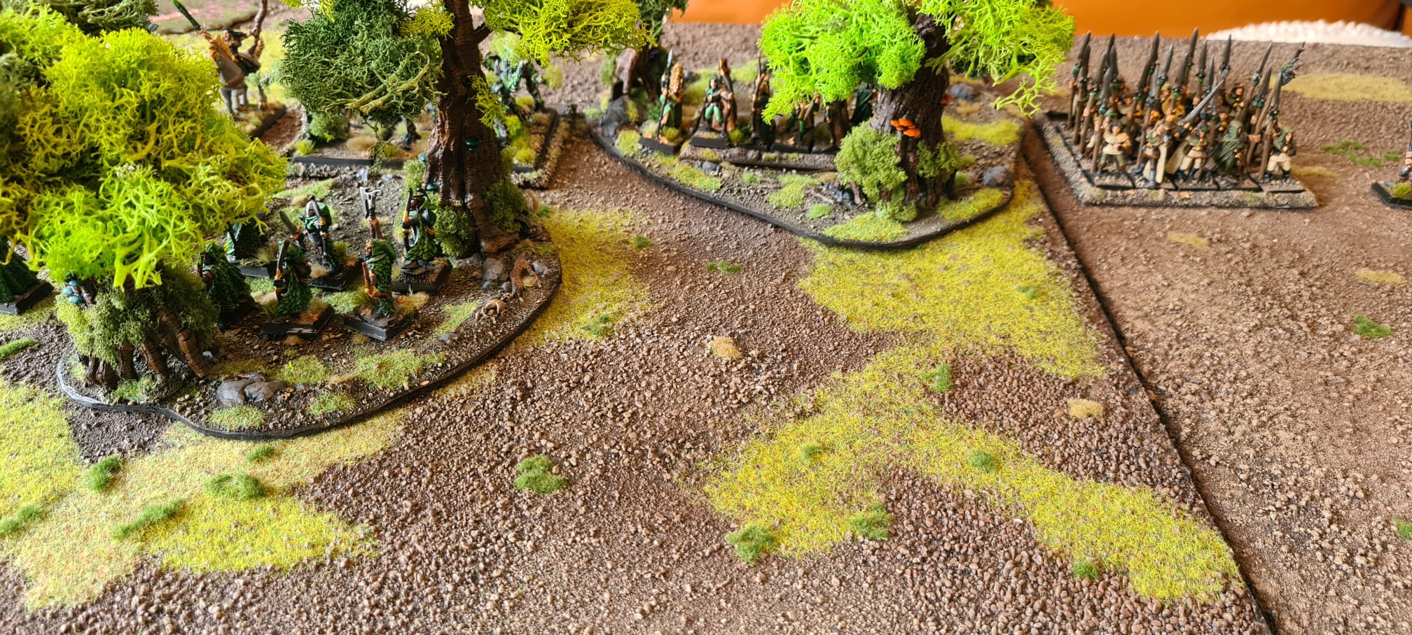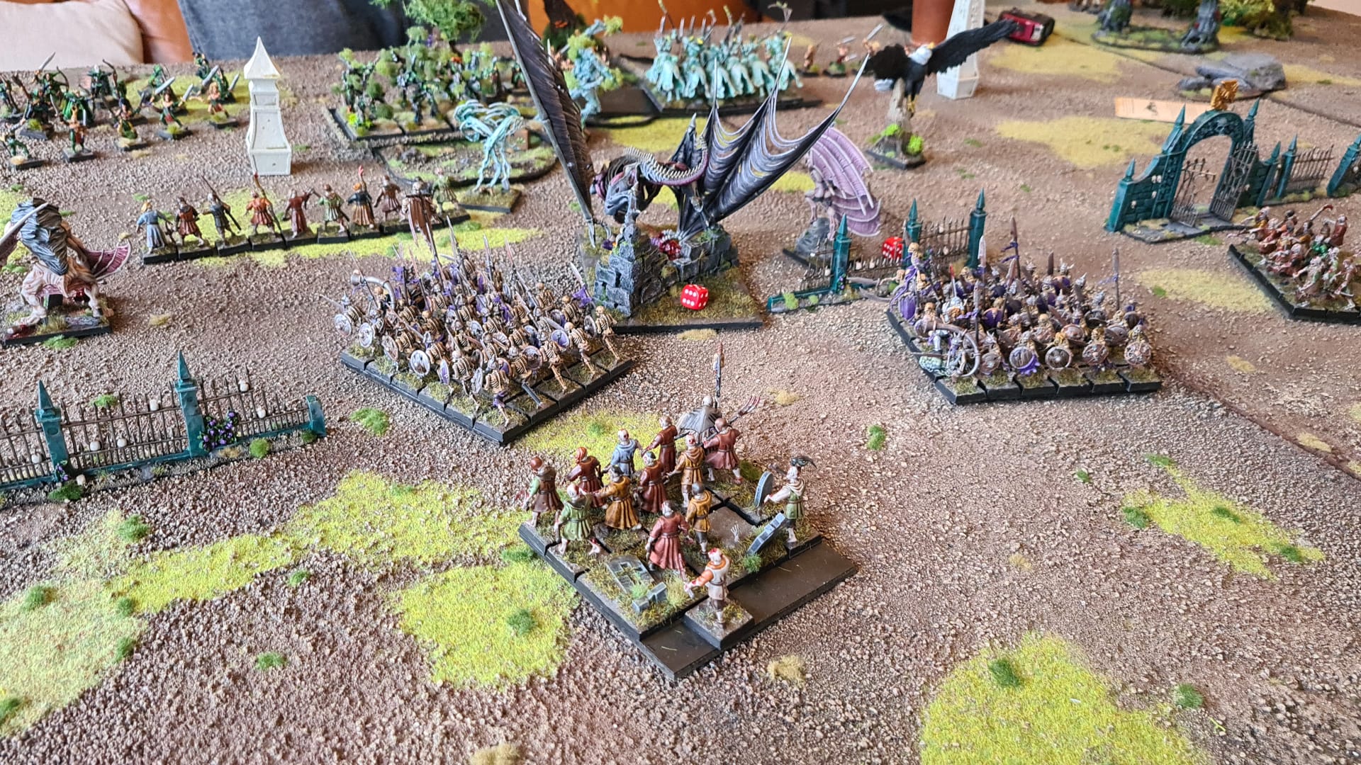 Sie berichteten ihrem Herren, dass sich dunkle Mächte an der Begräbnisstätte der Menschen zu schaffen machten. Sie sahen, wie sich Leichen aus dem Boden gruben, in der Abenddämmerung kreisten Wesen mit riesigen Schwingen über dem Leichenfeld und nachts waberten unwirkliche türkis schimmernde Wesen über die Gräber. Aerendyl konnte es nicht recht glauben. Nekromantie und das direkt an den Grenzen zu Lyrei Loren? Je doch war er in der Abwesenheit seiner Späher nicht untätig gewesen. Aerendyl beauftrage Lathai, einen Adligen, dem die Ehre gebührte, das Banner von Lyrei Loren zu führen, seine Truppen zu versammeln: 20 Krieger der Ewigen Wache, 10 Waldläufer, 10 Waldelfenkrieger mit ihren berüchtigten Hexenfluchpfeilen, 5 Waldreiter und 10 Kampftänzer, die sich in zwei 5er-Gruppen teilten, standen auf dem Platz vor der Großen Eiche bereit. Außerdem entsandte er Ariawyn, eine junge Zaubersängerin mit dem Hang zur Weißen Magie, in die Wälder, um die Waldgeister zu kontaktieren. (Mein Kollege hatte sicher vertan und vergessen, dass die Zaubersänger nicht die Lehre der Weißen Magie nutzen können. Was wir erst nach dem Spiel bemerkten. Es war am Ende, aber nicht relevant.) Die Zeit drängte, der Feind wurde immer stärker und von Ariawyn war noch immer keine Spur zu sehen. Am dritten Tage erschien Ariawyn, gefolgt von: 1 Riesenadler, 6 Baumschraten und 1 Baummenschen unter dessen Schritten der Boden bebte.